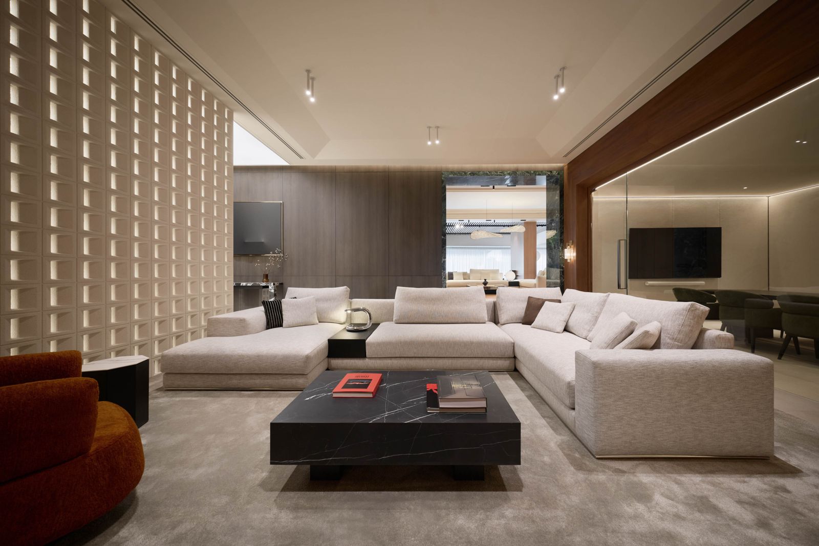 สำหรับ ADAM Flagship Store เป็นพื้นที่ที่ได้รับการออกแบบขึ้นอย่างพิถีพิถันเพื่อถ่ายทอดอัตลักษณ์ของแบรนด์ผ่านบรรยากาศที่เรียบหรู บนพื้นที่ขนาดกว่า 600 ตารางเมตร ครอบคลุมทั้งสองชั้นของ Crystal Design Center (CDC) โดยทุกมุมของโชว์รูมถูกออกแบบให้เป็นมากกว่าพื้นที่จัดแสดงเฟอร์นิเจอร์ แต่คือการผสานงานออกแบบตกแต่งภายใน (Interior Design) และเฟอร์นิเจอร์เข้าไว้ด้วยกันอย่างกลมกลืน ตั้งแต่พื้น ผนัง แสง ไปจนถึงฝ้า ทุกองค์ประกอบถูกคิดและออกแบบให้เชื่อมโยงกันอย่างลงตัว พร้อมจัดสรรพื้นที่เป็นห้องจำลองในแต่ละโซนของบ้าน เพื่อให้ผู้มาเยี่ยมชมสามารถมองเห็นภาพการใช้งานจริง สัมผัสบรรยากาศการอยู่อาศัยระดับลักชัวรี และช่วยให้การเลือกเฟอร์นิเจอร์เป็นเรื่องง่ายและมั่นใจยิ่งขึ้น