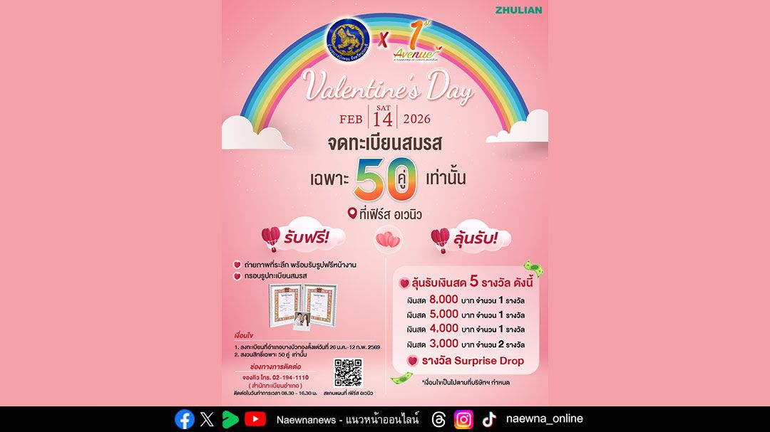สำหรับคู่รักที่สนใจสามารถลงทะเบียนล่วงหน้าได้ที่สำนักทะเบียน อำเภอบางบัวทอง โทร 02-194-1110 ตั้งแต่วันนี้ถึงวันที่ 12 กุมภาพันธ์ 2569 จำกัดจำนวนผู้เข้าร่วมเพียง 50 คู่เท่านั้น