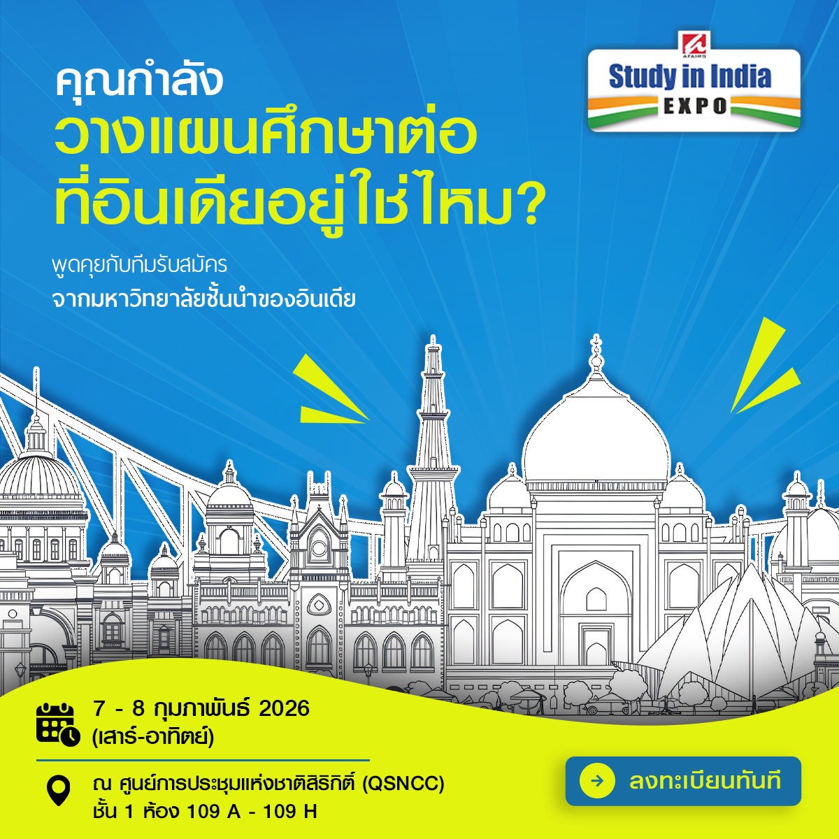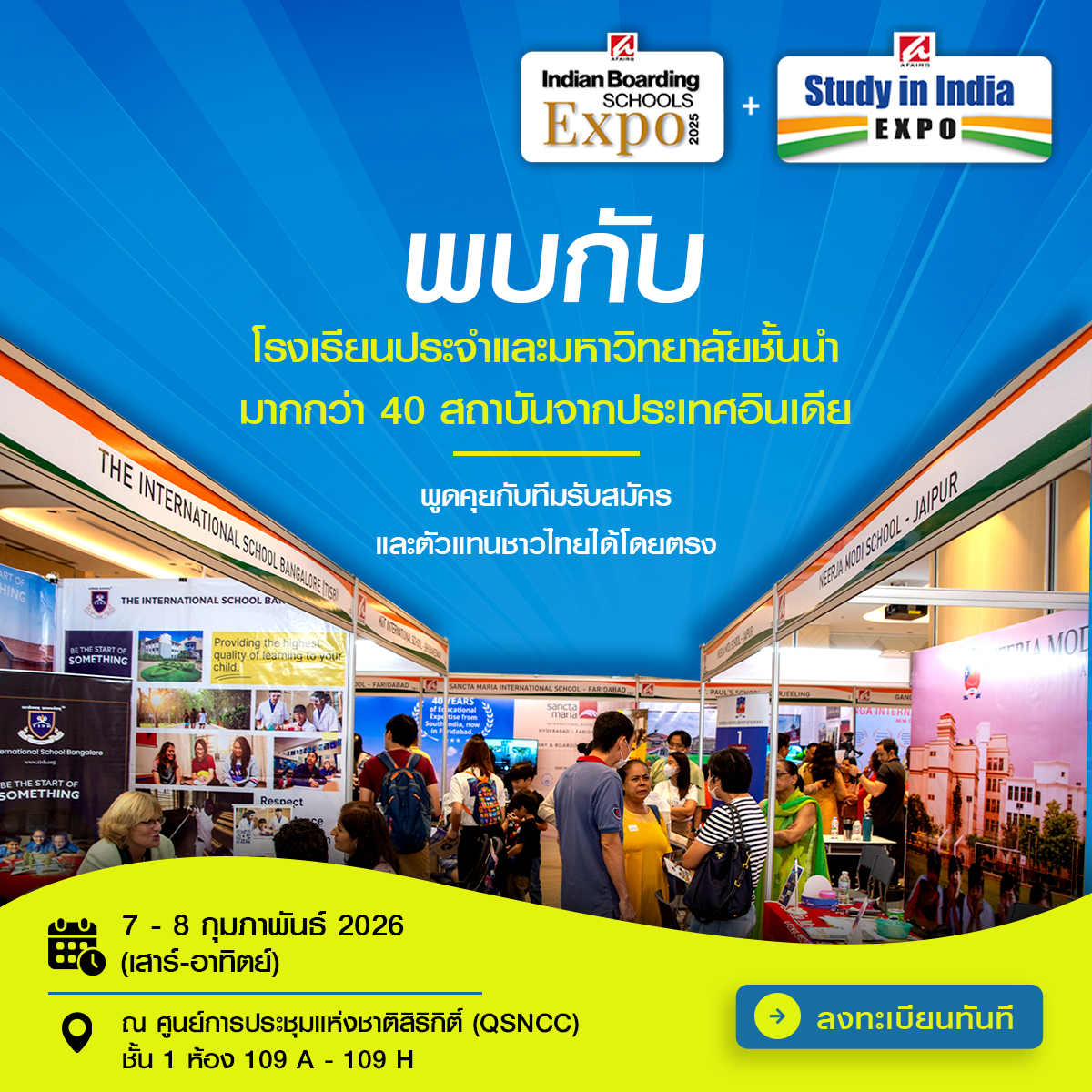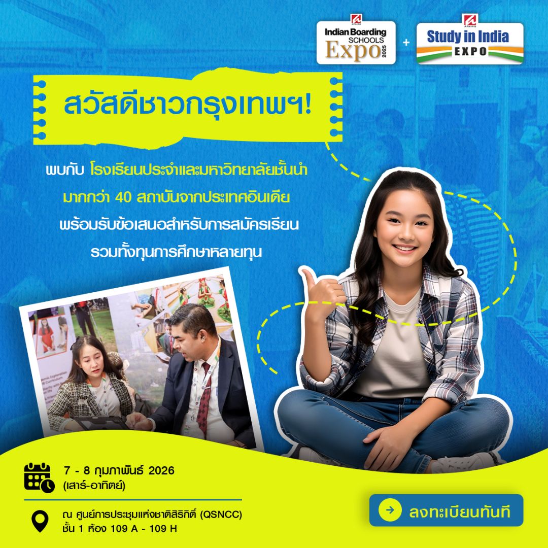 AFAIRS Exhibitions & Media Pvt. Ltd. จากประเทศอินเดีย ภูมิใจประกาศการกลับมาของงาน Study in India Expo และ Indian Boarding Schools Expo สู่กรุงเทพมหานคร ซึ่งจัดขึ้นอย่างต่อเนื่องเป็นปีที่ 16 ในประเทศไทย งานมหกรรมการศึกษาที่ทุกคนรอคอยนี้จะจัดขึ้นใน วันที่ 7 – 8 กุมภาพันธ์ 2026 ณ ศูนย์การประชุมแห่งชาติสิริกิติ์ (QSNCC)