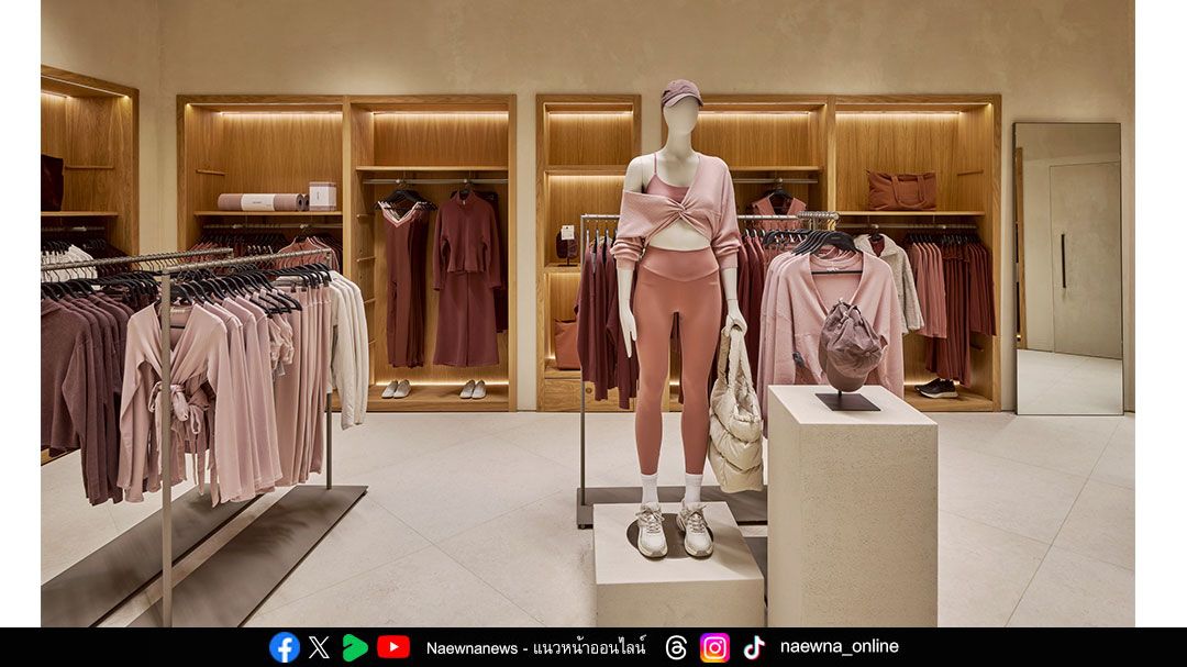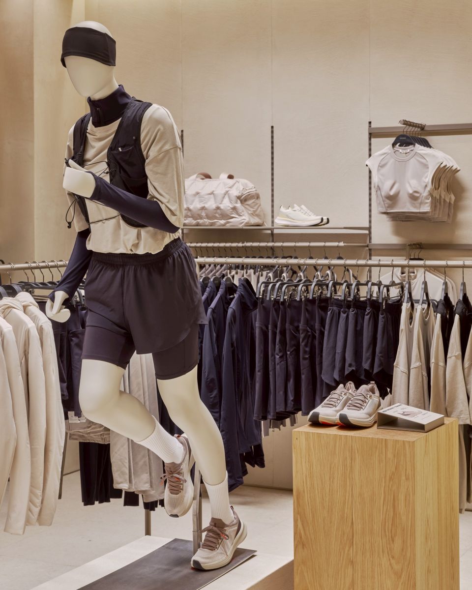 ด้านโครงสร้างสถาปัตยกรรมและวัสดุ ความอบอุ่น ผิวสัมผัสจากธรรมชาติ และแสงสว่าง คือองค์ประกอบสำคัญ ภายในร้านจึงเลือกใช้เป็นพื้นกระเบื้องพอร์ซเลนเพื่อให้เข้ากับวัสดุที่คัดสรรมาอย่างพิถีพิถัน โซนต้อนรับโดดเด่นด้วยผนัง earth-block งานแฮนด์คราฟต์ สะท้อนตัวตนของแบรนด์และชูภาพลักษณ์ความเป็นแบรนด์ผู้นำเทรนด์ Athleisure ตั้งแต่ก้าวแรกที่เข้าสู่ร้าน และไม้โอ๊คธรรมชาติ ถูกนำมาใช้เป็นองค์ประกอบหลักโดยรอบพื้นที่ ซึ่งช่วยเพิ่มสัมผัสที่ให้ความอบอุ่น ขณะที่แสงสว่างมีบทบาทสำคัญในการออกแบบครั้งนี้ ด้วยการเดินระบบไฟเส้นแบบต่อเนื่องที่ออกแบบพิเศษ สร้างบรรยากาศร่วมสมัยที่อบอุ่นและเป็นมิตร พร้อมนำสายตาไปตลอดเส้นทางการช้อปปิ้งภายในร้าน