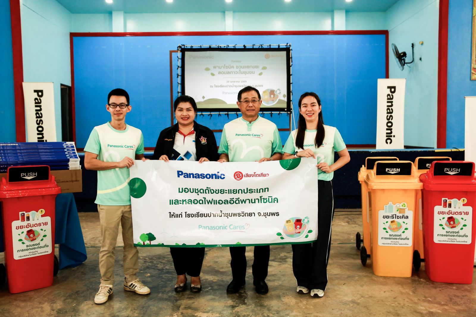 ล่าสุด กลุ่มบริษัทพานาโซนิคในประเทศไทย ร่วมกับ บริษัท เสียงโตเกียว จำกัด สานต่อกิจกรรม “พานาโซนิค ชวนแยกขยะ ลดมลภาวะในชุมชน” ลงพื้นที่จังหวัดชุมพร เพื่อสร้างจิตสำนึกด้านสิ่งแวดล้อมอย่างยั่งยืน โดยมี นายฮิเดคาสึ อิโตะ ซีอีโอ กลุ่มบริษัทพานาโซนิค ในประเทศไทย นำทีมพนักงานมอบชุดถังขยะแยกประเภท พร้อมหลอดไฟพานาโซนิค แอลอีดี ประหยัดพลังงาน จำนวน 100 หลอด ให้แก่โรงเรียนปากน้ำชุมพรวิทยา จังหวัดชุมพร เพื่อสนับสนุนการจัดการขยะอย่างถูกวิธี และเสริมสร้างสภาพแวดล้อมที่เอื้อต่อการเรียนรู้ ซึ่งมี นางสาวปวีณา นาคหกวิค ผู้อำนวยการ โรงเรียนปากน้ำชุมพร เป็นผู้รับมอบ และ นายเอกพงษ์ เตชะวงศ์ถาวร กรรมการผู้จัดการ บริษัท เสียงโตเกียว จำกัด ร่วมเป็นสักขีพยาน