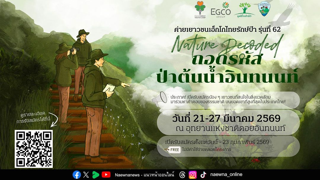 บริษัท ผลิตไฟฟ้า จำกัด (มหาชน) หรือ EGCO Group และมูลนิธิไทยรักษ์ป่า องค์กรสาธารณกุศลซึ่งก่อตั้งและสนับสนุนการดำเนินงานโดย EGCO Group ร่วมกับอุทยานแห่งชาติดอยอินทนนท์ ชวนเยาวชนระดับมัธยมศึกษาตอนปลายหรือเทียบเท่าจากทั่วประเทศ มาร่วมภารกิจไขรหัสลับของธรรมชาติ ผ่านการสัมผัสป่าต้นน้ำด้วยตนเอง กับ “ค่ายเยาวชนเอ็กโกไทยรักษ์ป่า รุ่นที่ 62” ภายใต้แนวคิด “Nature Decoded: ถอดรหัสป่าต้นน้ำ อินทนนท์” ระหว่างวันที่ 21 – 27 มีนาคม 2569 ณ อุทยานแห่งชาติดอยอินทนนท์ จังหวัดเชียงใหม่ เพื่อปลูกจิตสำนึกรักษ์ธรรมชาติและส่งเสริมการดำเนินชีวิตที่อยู่ร่วมกับสิ่งแวดล้อมอย่างยั่งยืน เยาวชนหัวใจกรีนที่สนใจ สามารถส่งผลงานเป็น “เรียงความ” หรือ “คลิปวิดีโอสั้น” เพื่อสมัครร่วมค่ายเยาวชนฯ ได้ตั้งแต่ วันนี้ - 23 กุมภาพันธ์ 2569