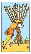 อิทธิพลของไพ่ 10 ไม้เท้า (Ten of Wands) คุณจะเครียดกับงาน เหตุเพราะว่างานหนักเกินเมื่อเทียบกับผลตอบแทนที่รับอยู่ จนทำให้บางรายคิดอยากจะลาออก และที่มีธุรกิจส่วนตัวกิจการต้องค่อยเป็นค่อยไป อย่าเพิ่งคิดขยายออกไป ด้านความรักมีเรื่องเครียดๆ มีปัญหากับคนรักเพราะเรื่องเวลาที่ไมลงตัว และคนที่แอบลุ้นใครระวังจะโดนหลอกใช้ ด้านการเงินมีเข้ามาพอได้ แต่การเสี่ยงไม่เด่น จองอย่าริ และคนที่เป็นหนี้อยู่ จะปวดหัวเพราะโดนทวงถาม ควรทำบุญไหว้บูชาพระธาตุนาดูนเพื่อเสริมดวงชะตาตนเอง