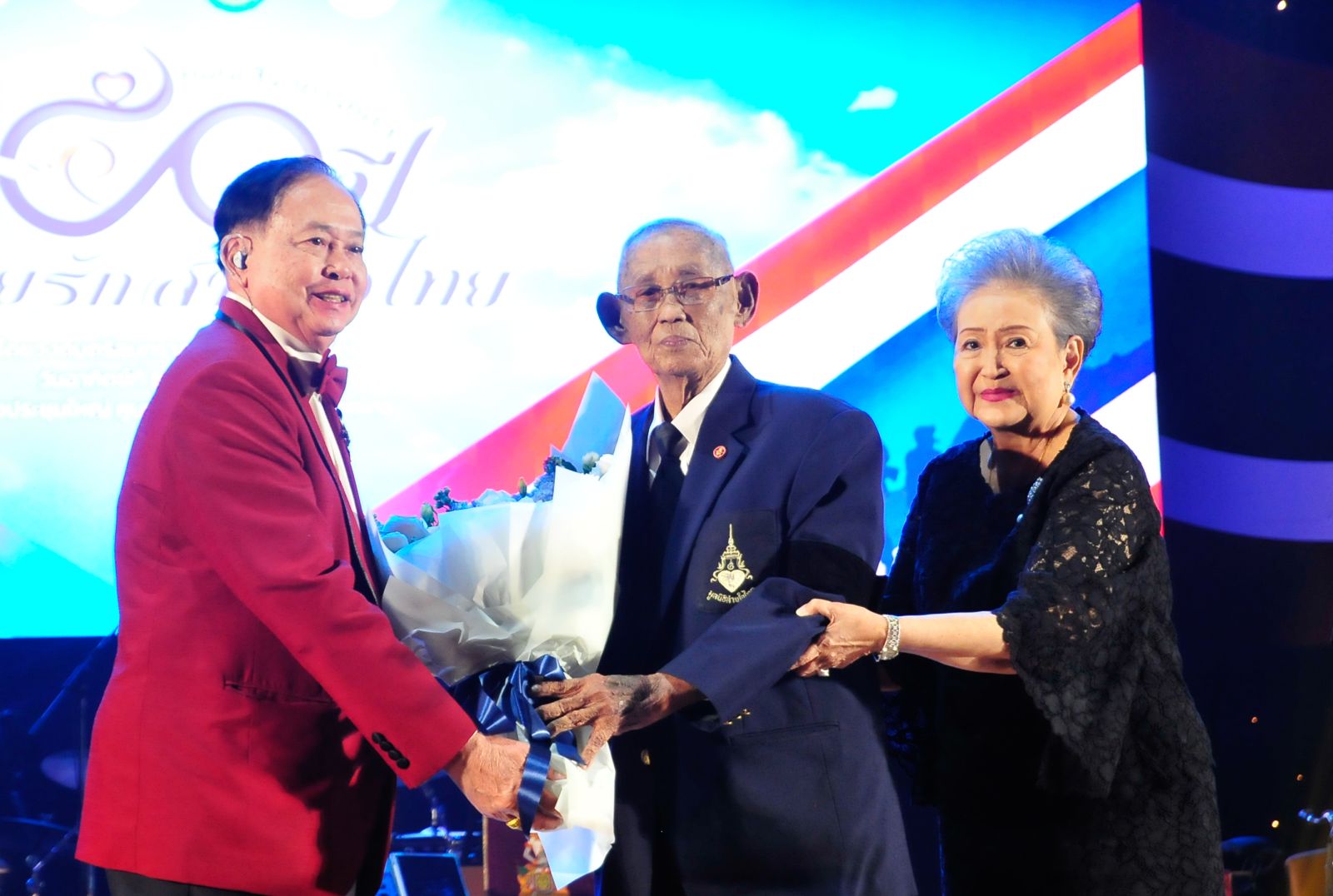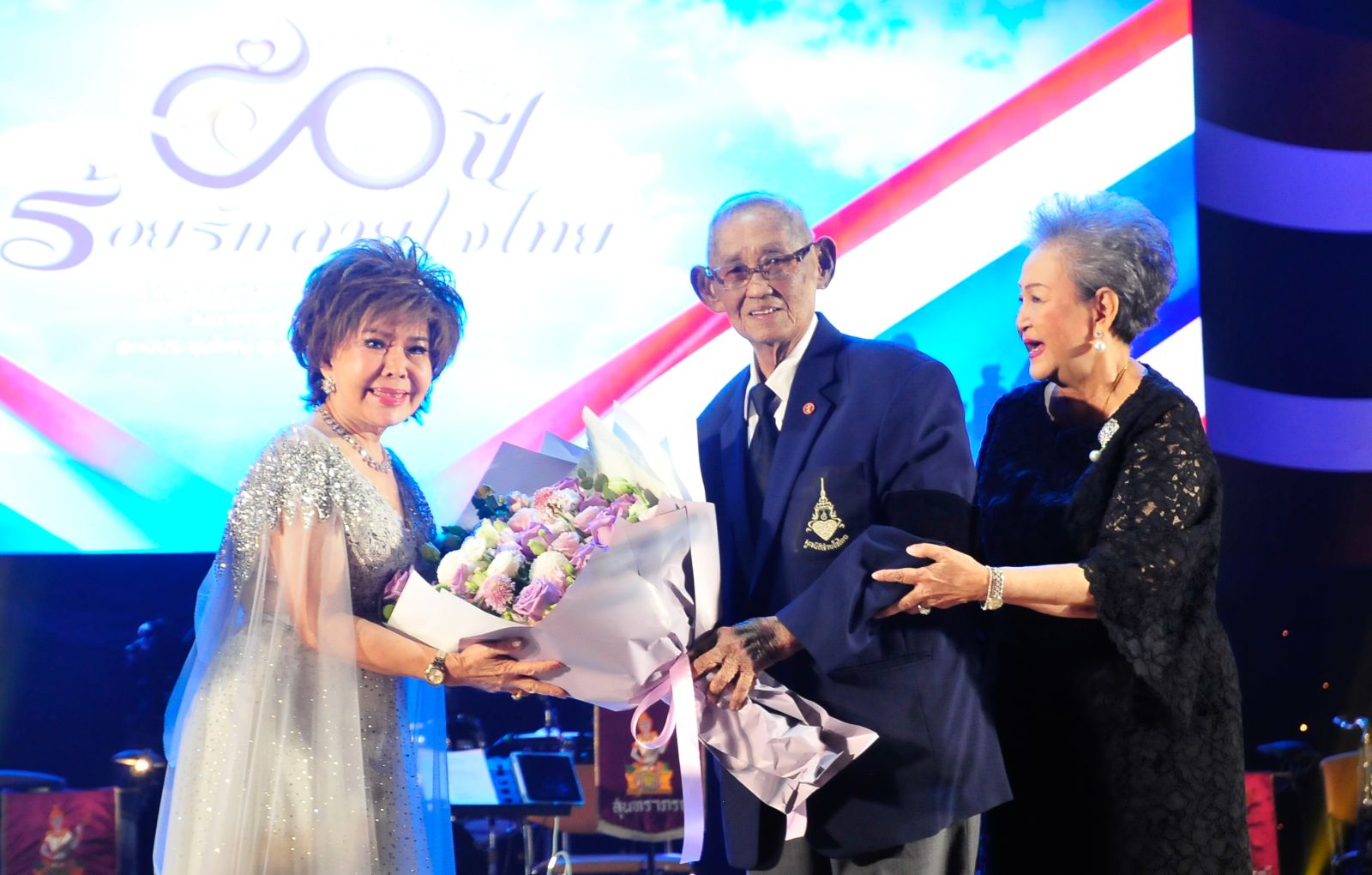 พล.ท.นพ.ธำรงรัตน์ แก้วกาญจน์ และ อติพร สุนทรสนาน เสนะวงศ์ มอบดอกไม้แก่ ครูณรงค์ เนตรเจริญ ผู้ควบคุมวงดนตรีสุนทราภรณ์