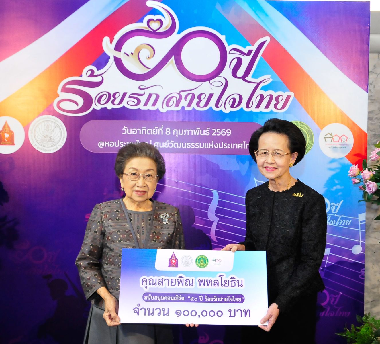 มูลนิธิสายใจไทย ในพระบรมราชูปถัมภ์ ร่วมกับ มูลนิธิสุนทราภรณ์ ในพระราชูปถัมภ์ สมเด็จพระกนิษฐาธิราชเจ้า กรมสมเด็จพระเทพรัตนราชสุดา ฯ สยามบรมราชกุมารี กรมส่งเสริมวัฒนธรรม และสมาคมนิสิตเก่าอุตสาหกรรมเกษตร มหาวิทยาลัยเกษตรศาสตร์ (สอก.) จัด “คอนเสิร์ตการกุศล 50 ปีร้อยรักสายใจไทย” เมื่อวันที่ 8 กุมภาพันธ์ 2569 ณ หอประชุมใหญ่ ศูนย์วัฒนธรรมแห่งประเทศไทย เพื่อนำรายได้ไปช่วยเหลือทหารและผู้ได้รับบาดเจ็บและเสียชีวิตจากการพิทักษ์แผ่นดินไทย ส่งเสริมทักษะอาชีพและการศึกษาบุตรเพื่อคุณภาพชีวิตที่ดี ของครอบครัว ตลอดจนประชาชนที่ได้รับผลกระทบจากสถานการณ์ความไม่สงบตามแนวชายแดน