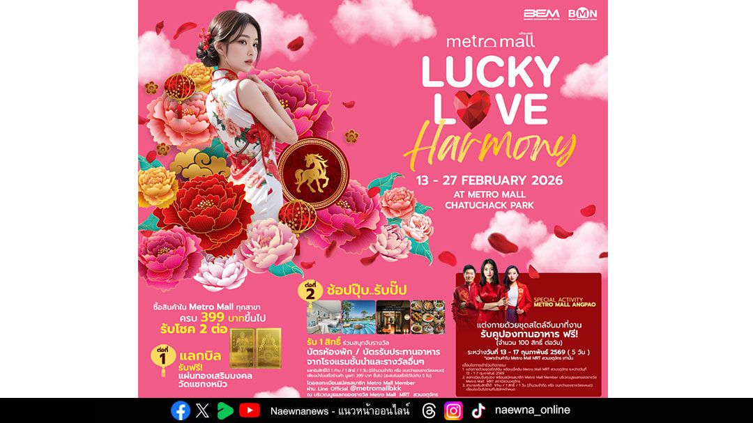สายมูเตรียมตัวให้พร้อม! บริษัท แบงคอก เมโทร เน็ตเวิร์คส์ จำกัด (BMN) ในเครือของ บริษัท ทางด่วนและรถไฟฟ้ากรุงเทพ จำกัด (มหาชน) หรือ BEM ชวนร่วมเฉลิมฉลองเทศกาลตรุษจีนและ วาเลนไทน์ ต้อนรับปีม้าไฟ กับงาน Metro Mall Chinese New Year 2026 ภายใต้แนวคิด “Lucky Love Harmony รักสมดุล เฮงสมหวัง” สัมผัสบรรยากาศแห่งความโชคดีและความรัก พร้อมกิจกรรมสุดมงคลที่ ห้ามพลาด อาทิ การแสดงเชิดสิงโตและมังกรโชคลาภ, การแสดงบนเวที 5 วันรวด, กิจกรรมแต่งชุดจีน รับอั่งเปาเมนูเด็ด ในวันที่ 13 - 17 กุมภาพันธ์ แต่งชุดสไตล์จีน พร้อมเช็คอิน Metro Mall MRTสวนจตุจักร รับฟรี! คูปองทานอาหาร จำนวน 500 สิทธิ์ (จำกัดวันละ 100 สิทธิ์ ) *เฉพาะร้านค้าใน Metro Mall MRT สวนจตุจกรเท่านั้น