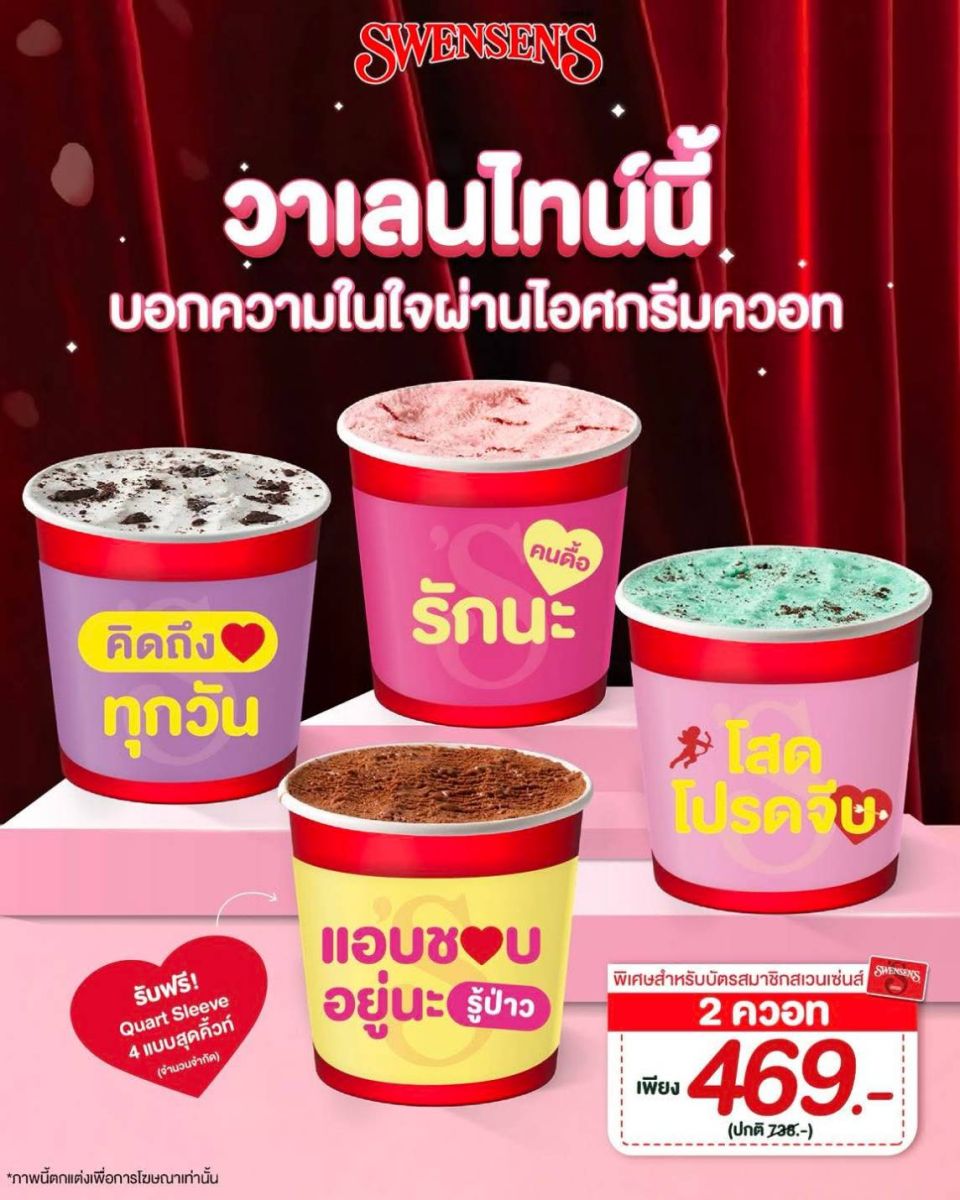 หลังจากอิ่มอร่อยกับมื้อหลักแล้ว การเติมความหวานด้วยของหวาน คือช่วงเวลาที่ช่วยปิดท้ายวาเลนไทน์ได้อย่างสมบูรณ์ อย่าง Swensen’s ชั้น G คืออีกหนึ่งตัวเลือกสำหรับการนั่งชิลต่อกับไอศกรีมหลากหลายรสชาติ ไม่ว่าจะเป็น Sticky Chewy Chocolate, Strawberry หรือ Mint Chocolate Chip ที่พร้อมเสิร์ฟความหวานในวันพิเศษ และพิเศษยิ่งขึ้นสำหรับสมาชิกบัตร Swensen’s กับโปรโมชัน ซื้อไอศกรีมควอท 2 ถ้วย ทุกรสชาติ ในราคาเพียง 469 บาท (จากปกติ 738 บาท) ส่วนลูกค้าทั่วไปสามารถซื้อได้ในราคา ควอทละ 369 บาท ตั้งแต่วันนี้ –15 กุมภาพันธ์ 2569 เท่านั้น
