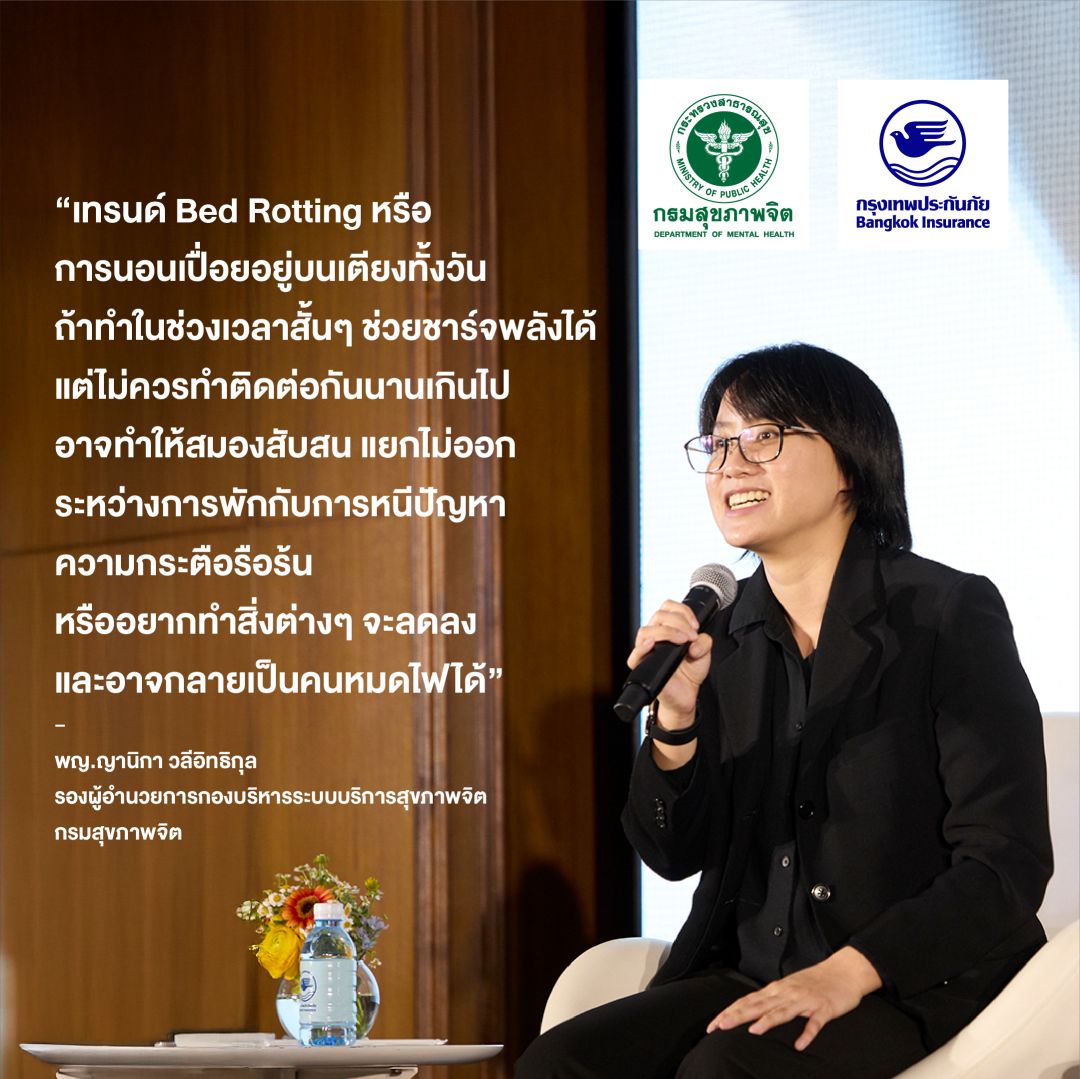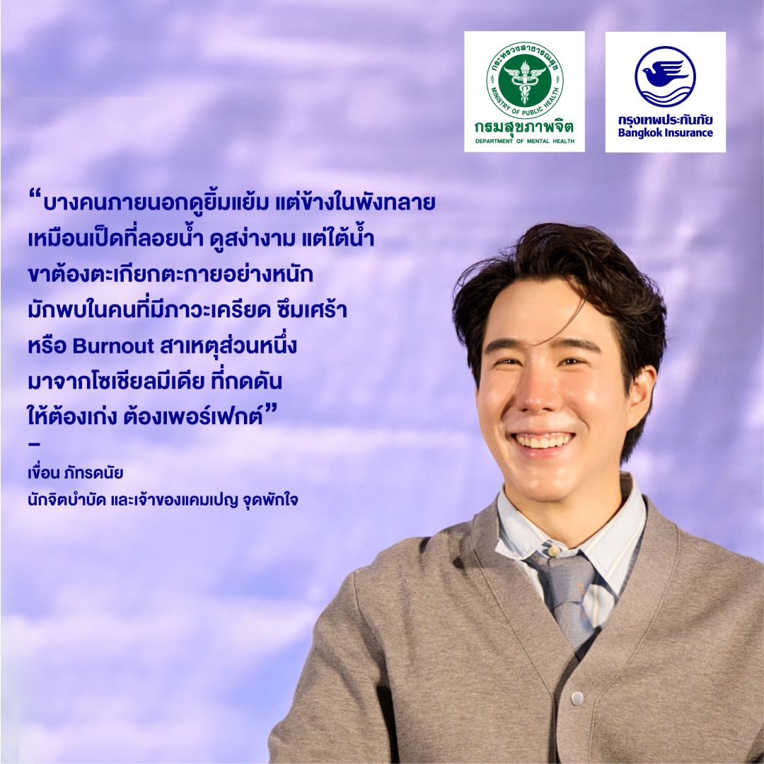 กรุงเทพประกันภัย มุ่งหวังเป็นอย่างยิ่งว่า กิจกรรมในครั้งนี้จะเป็นส่วนหนึ่งในการสร้างเกราะป้องกันทางใจที่แข็งแกร่งให้แก่นักศึกษาและผู้ร่วมกิจกรรม รวมถึงได้มีส่วนร่วมขับเคลื่อนสังคมให้เป็นพื้นที่ที่เปิดกว้างและ มีความเข้าใจในเรื่องสุขภาพจิตมากยิ่งขึ้น สำหรับผู้ที่ต้องการคำปรึกษาด้านสุขภาพจิตสามารถติดต่อได้ที่สายด่วน กรมสุขภาพจิต โทร. 1323
