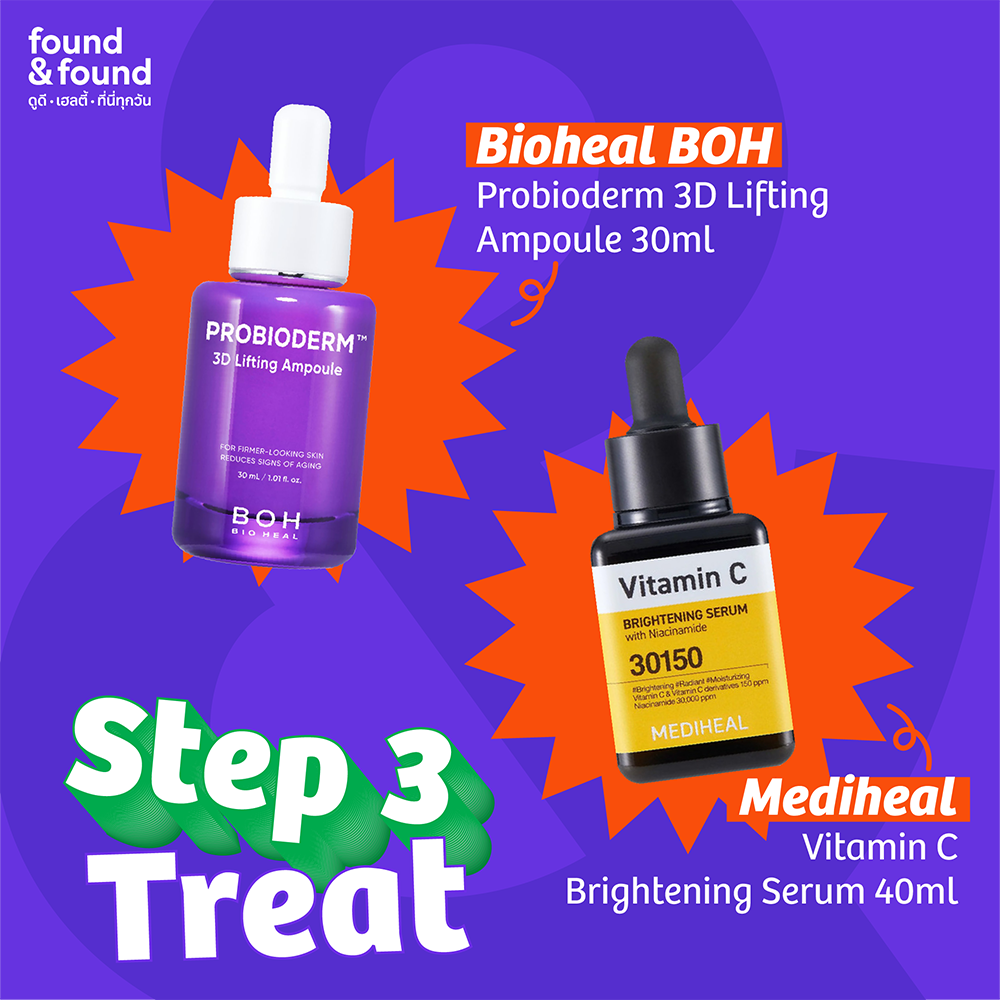 3. Treat – ดูแลปัญหาผิวแบบตรงจุด เลือกเซรั่มหรือแอมพูลที่ตอบโจทย์ปัญหาผิวเฉพาะบุคคล เช่น ผิวอ่อนแอ รอยแดง สิว หรือผิวขาดน้ำ เน้นการดูแลแบบเฉพาะจุด ไม่บำรุงเกินความจำเป็น