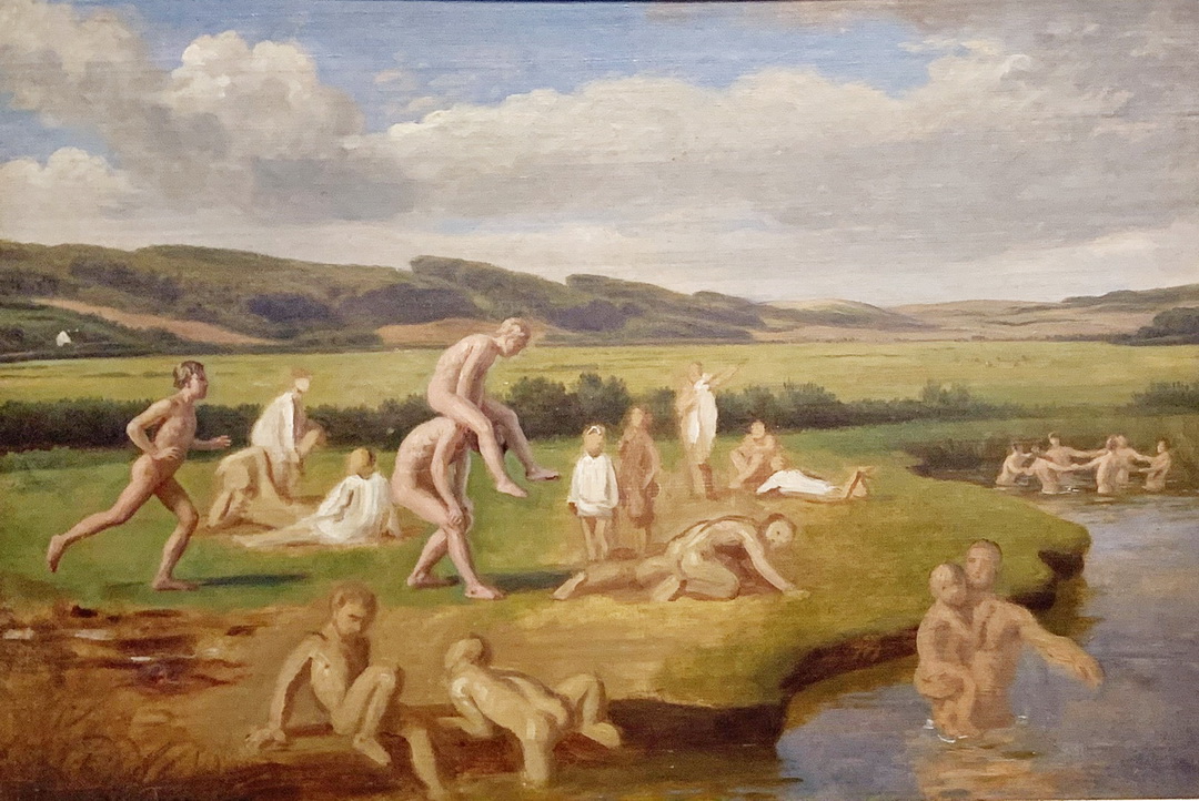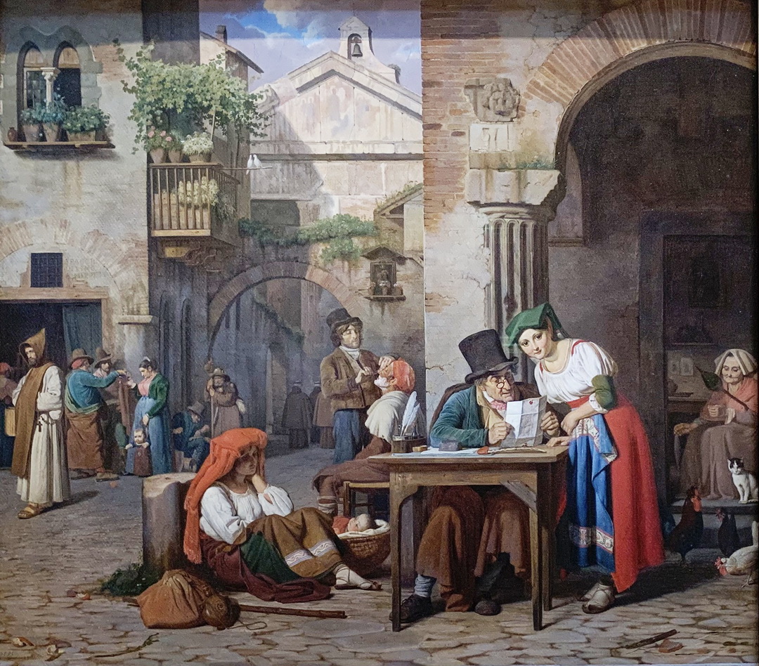 A Roman Scribe Reading a Letter to a Young Woman โดย Ernst Meyer ภาพเจ้าหน้าที่รัฐกำลังอ่านและเขียนจดหมายให้กับกลุ่มที่อ่านหนังสือไม่ออก อาทิ หญิงที่ละทิ้งบ้านเกิดอุ้มลูกมาทำมาหากินในโรม โดยมีฉากหลังเป็นภาพคนตัดผม เป็นภาพสะท้อนถึงชีวิตจริงในช่วงปี 1829 จริง ๆ La Gensola in Rome โดย Ditlev Blunck ภาพเหมือนกลุ่มศิลปินเดนนิสที่รวมตัวกันในโรมในปี 1836 ที่เป็นภาพสะท้อนชีวิตประจำวันในช่วงเวลานั้นนี้ประกอบด้วยครอบครัวชาวอิตาลีทางด้านซ้ายและชาวเดนนิสทางด้านขวาโดยมีรูปปั้น Thorvaldsen ตรงปลายโต๊ะ ผลงานชิ้นนี้ศิลปินรังสรรค์ไว้เป็นที่ระลึกในการเดินทางไปยังโรมของเขา Boys Bathing and Playing โดย Constantin Hansen ผลงานที่สะท้อนความต้องการของศิลปินที่จะคงไว้ซึ่งอดีตที่สูญหาย ผลงานชิ้นนี้สามารถเรียกคืนวันคืนเก่า ๆ ที่เสมือนสวรรค์บนดินของชาวบ้านที่ดำรงชีวิตอย่างเรียบง่าย เชื่องช้า สงบสุขและสนุกสนานแตกต่างจากยุคสมัยอุตสาหกรรมที่เต็มไปด้วยความเร่งรีบ