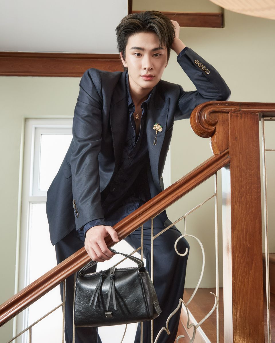 ไทย ชญานนท์ ในลุคแจ็คเก็ตสูทผ้าวูล สวมคู่เสื้อเชิ้ตและกางเกง พร้อมกระเป๋า Vittoria เสริมความโดดเด่นด้วยเข็มกลัด Sicily Brooch ทองคำขาวและทองคำประดับมรกตและเพชร สะท้อนงานโกลด์สมิธชั้นสูง และสร้อย Good Luck Necklace ทองคำขาวและทองคำประดับทับทิม ที่ช่วยเติมประกายอันสง่างามให้ลุคสมบูรณ์แบบ