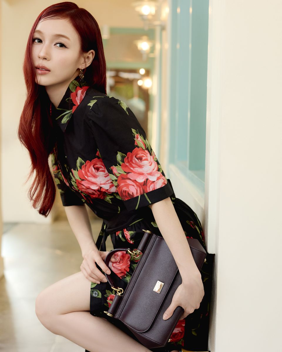 เลิฟ ภัทรานิษฐ์ สะท้อนเสน่ห์ความเป็นเฟมินีนผ่านเดรสเชิ้ตผ้าป๊อปลินพิมพ์ลาย Rose bouquet โทนดำ-แดง อันเป็นบทกวีแห่งความอ่อนหวานเหนือกาลเวลา ถือกระเป๋า The Sicily สัญลักษณ์แห่งความสง่างาม พร้อมด้วยไฟน์จิวเวลรี Sicily Earrings ทองคำ 18 กะรัต ประดับแบล็กแซฟไฟร์และแบล็กเจด ช่วยยกระดับลุคให้โดดเด่นอย่างมีรสนิยม