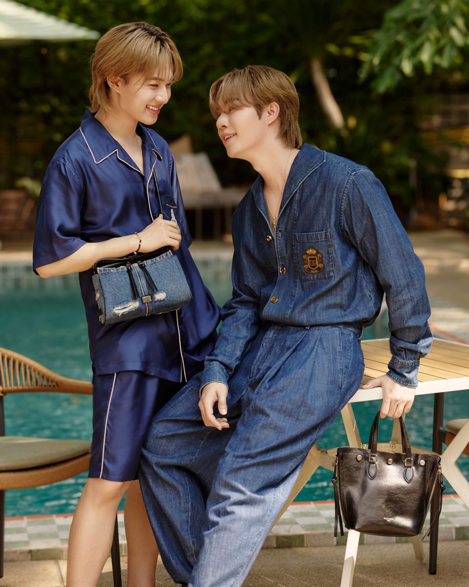 นุนิว ชวรินทร์ เลือกสวมเสื้อเชิ้ตไหมและกางเกงขาสั้น จับคู่กระเป๋า Vittoria เดนิมแพตช์เวิร์ก สะท้อนกลิ่นอายลำลองหรู เสริมด้วยสร้อยข้อมือ Sicily Bracelet ผ้าถักประดับไม้กางเขนทองคำ 18 กะรัต เติมกลิ่นอายร่วมสมัยอย่างมีเอกลักษณ์