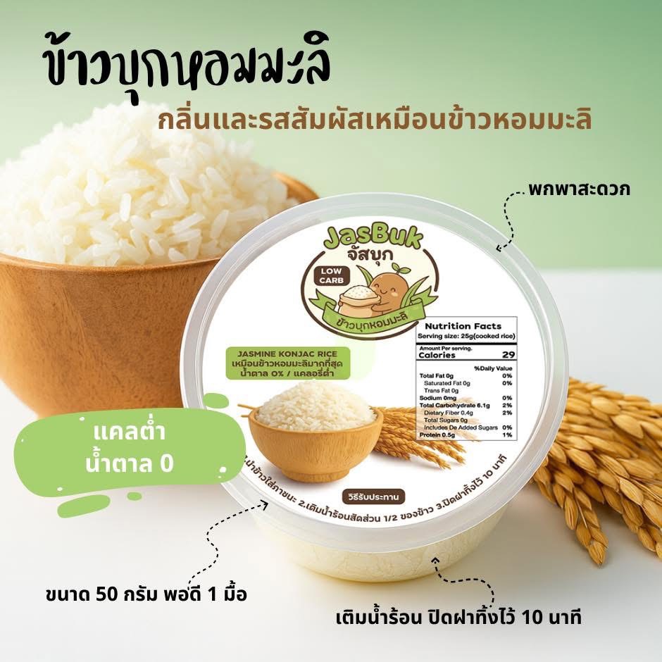 ใครที่กำลังมองหาตัวช่วยด้านสุขภาพ อยากลดแป้ง คุมน้ำตาล แต่สามารถเอ็นจอยกับมื้ออาหาร ต้องข้าวบุกหอมมะลิ จัสบุก เลยค่ะ ตอนนี้เรามีจำหน่ายอยู่ 2 แบบ คือ น้ำหนัก 500 กรัม ราคา 269 บาท และขนาด 1 กิโลกรัม ราคา 520 บาท โดยขนาด 1 กิโลกรัม สามารถทานได้ 20 มื้อโดยประมาณสำหรับผู้หญิง และยังมีฮาลาลด้วย”