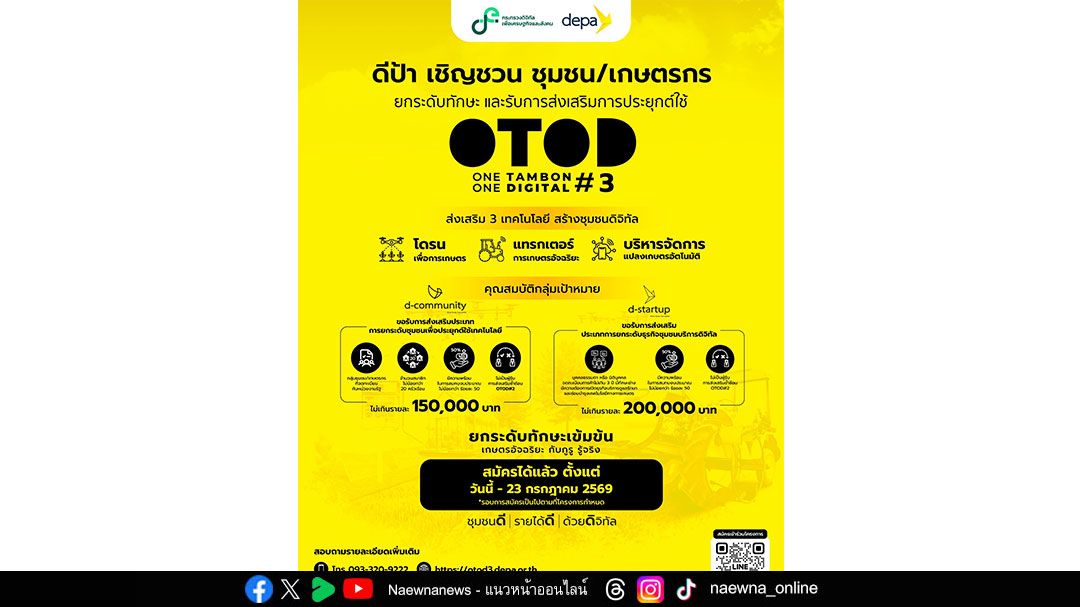 ดีป้า เปิดรับสมัครกลุ่มชุมชนและเกษตรกร เข้าร่วมโครงการ 1 ตำบล 1 ดิจิทัล ซีซัน 3 (One Tambon One Digital: OTOD #3) เพื่อรับการส่งเสริมการพัฒนาทักษะด้านการประยุกต์ใช้เทคโนโลยีดิจิทัลจากดิจิทัลสตาร์ทอัพภาคการเกษตรสัญชาติไทยที่ได้รับเครื่องหมาย dSURE และขึ้นทะเบียนบนบัญชีบริการดิจิทัล (Thailand Digital Catalog) พร้อมนำเสนอไอเดียเพื่อขอรับการสนับสนุนเทคโนโลยี 1 จาก 3 ประเภท ได้แก่ โดรนเพื่อการเกษตร แทรกเตอร์การเกษตรอัจฉริยะ และระบบบริหารจัดการแปลงอัตโนมัติ