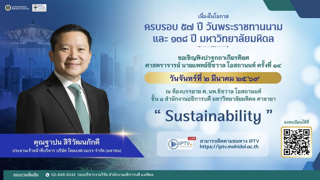 ในโอกาสนี้ ได้รับเกียรติจาก คุณฐาปน สิริวัฒนภักดี ประธานเจ้าหน้าที่บริหาร บริษัท ไทยเบฟเวอเรจ จำกัด (มหาชน) ในการปาฐกถาเกียรติยศ ศาสตราจารย์ นายแพทย์ชัชวาล โอสถานนท์ ครั้งที่ 14 หัวข้อ “Sustainability” ถ่ายทอดมุมมองด้านการบริหารองค์กรสู่ความยั่งยืนในบริบทโลกปัจจุบัน โดยในภาคบ่าย จัดพิธีมอบรางวัลเชิดชูเกียรติแก่บุคลากรและศิษย์เก่ามหาวิทยาลัยมหิดล ประจำปี 2568 แก่บุคคลผู้สร้างผลงานอันเป็นประโยชน์ต่อสังคมในด้านต่าง ๆ อาทิ รางวัลมหิดลทยากร รางวัลคนดีศรีมหิดล รางวัลอาจารย์ตัวอย่าง รางวัล MU Researchers of the Year 2026 รางวัลผู้มีผลงานการประดิษฐ์ที่ได้รับสิทธิบัตรและอนุสิทธิบัตร รางวัลบุคลากรดีเด่น รางวัลศิษย์เก่าดีเด่น และรางวัลอาจารย์ในดวงใจ ปิดท้ายกิจกรรมด้วยการรวมพลังศิษย์เก่าในงาน “MU BLUE NIGHT 2026” คืนสู่เหย้า เรามหิดล ครั้งที่ 9 เพื่อย้อนรำลึกถึงวันวานแห่งความผูกพันในรั้วมหิดล และเสริมสร้างเครือข่ายความสัมพันธ์อันเข้มแข็งระหว่างศิษย์เก่าทุกรุ่น
