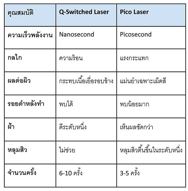ตารางเปรียบเทียบความต่าง Pico Laser กับ Q-Switched Laser