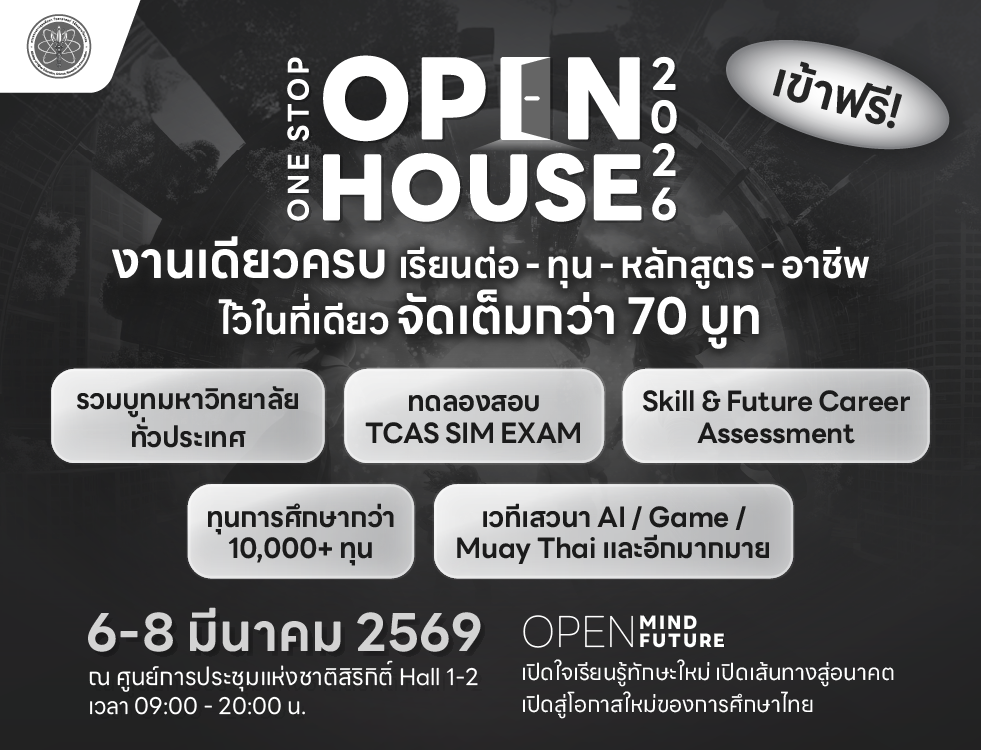 กระทรวง อว. เชิญชวนร่วมงาน ‘One Stop Open House 2026’ พื้นที่แห่งโอกาสให้เยาวชนไทยได้ค้นหาเส้นทางการศึกษาและอาชีพอย่างครบวงจร โดยรวบรวมบูธจากมหาวิทยาลัยชั้นนำทั่วประเทศมาไว้ในที่เดียว จัดเต็มกว่า 70 บูท พบกันในวันที่ 6 – 8 มีนาคม 2569 เข้าร่วมงานฟรี! เวลา 09.00 – 20.00 น. ณ ฮอลล์ 1–2 ชั้น G ศูนย์การประชุมแห่งชาติสิริกิติ์