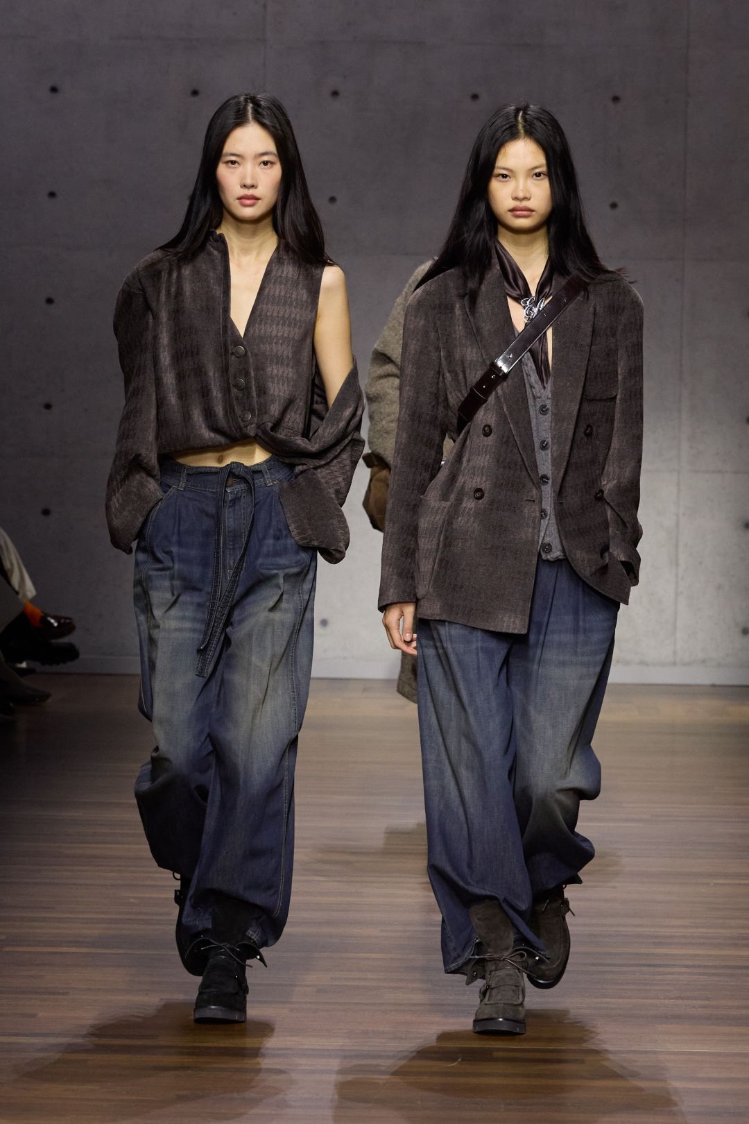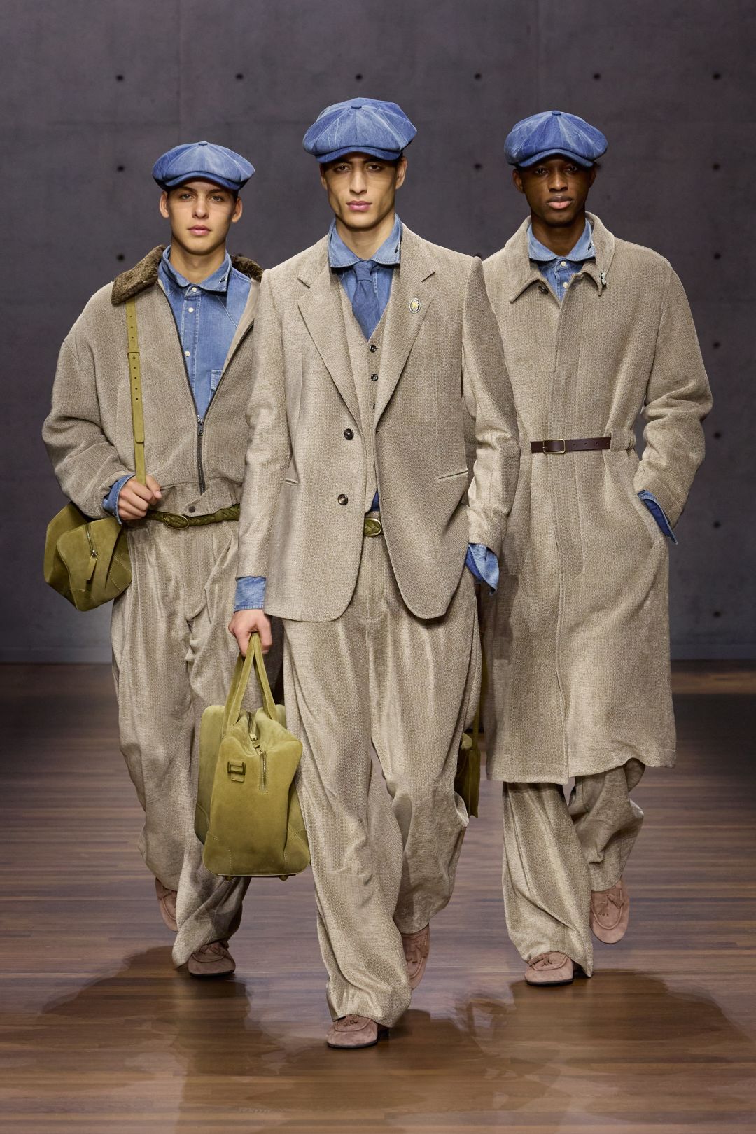 เนื้อผ้าที่เลือกใช้เน้นความหนานุ่มและมอบผิวสัมผัสที่โดดเด่น ทั้งผ้าทวีต ผ้าแจสเป้ ผ้าวูลผสมลินินที่ให้ความรู้สึกคุ้นเคยเมื่อสวมใส่ ผ้ากำมะหยี่เชนิลล์ เครื่องหนังที่ขัดแต่งลายเฟดแบบวินเทจ ไปจนถึงแจ็กเก็ตเชียร์ลิงขนเฟอร์ ส่วนโทนสีหลัก ได้แก่ สีเบจ สีเทาเบจ และสีเทา ที่ค่อยๆ ไล่ระดับกลมกลืนไปกับเฉดสีน้ำตาล สร้างมิติสีที่ลื่นไหล ก่อนจะตัดสลับอย่างมีชั้นเชิงด้วยสีน้ำเงินซิกเนเจอร์ของ Armani พร้อมแต่งแต้มสีสันด้วยสีแดงและสีม่วง