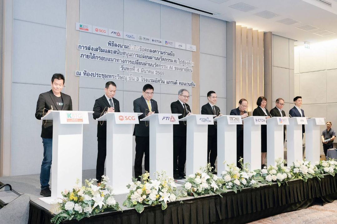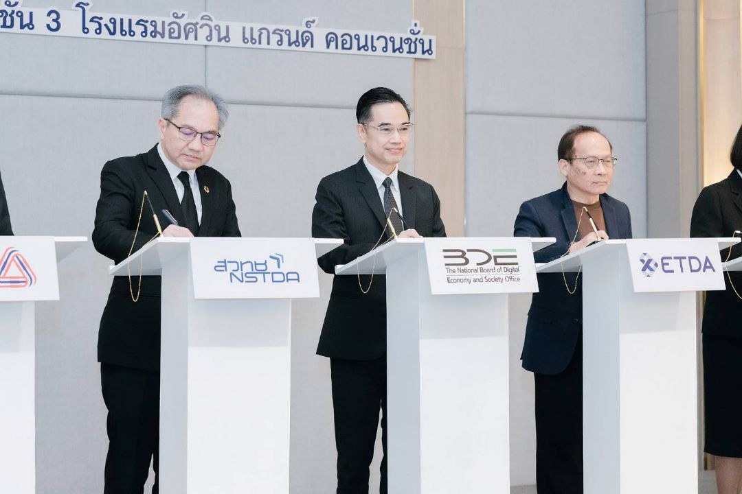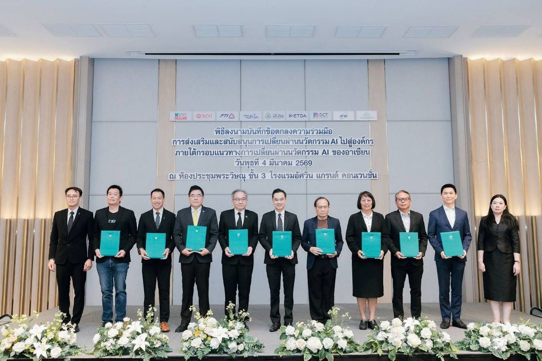 นอกจากนี้ การประชุมสัมมนาเพื่อเผยแพร่ผลการศึกษาของโครงการฯ ยังได้มีพิธีลงนามบันทึกข้อตกลงความร่วมมือ (MOU) การส่งเสริมและสนับสนุนการเปลี่ยนผ่านนวัตกรรม AI ไปสู่องค์กร ภายใต้กรอบแนวทางการเปลี่ยนผ่านนวัตกรรม AI ของอาเซียน จำนวน 9 หน่วยงาน ได้แก่ 1) สำนักงานคณะกรรมการดิจิทัลเพื่อเศรษฐกิจและสังคมแห่งชาติ 2) สำนักงานพัฒนาวิทยาศาสตร์และเทคโนโลยีแห่งชาติ 3) สำนักงานพัฒนาธุรกรรมทางอิเล็กทรอนิกส์ 4) สภาอุตสาหกรรมแห่งประเทศไทย 5) สภาดิจิทัลเพื่อเศรษฐกิจและสังคมแห่งประเทศไทย 6) สมาคมอุตสาหกรรมซอฟต์แวร์ไทย 7) มูลนิธิเพื่อการพัฒนาดิจิทัล 8) บริษัท กสิกร แล็บส์ จำกัด และ 9) บริษัท ปูนซิเมนต์ไทย จำกัด (มหาชน) โดยมีวัตถุประสงค์เพื่อส่งเสริมและสนับสนุนให้เกิดการนำกรอบแนวทางการเปลี่ยนผ่านนวัตกรรม AI ของอาเซียน มาใช้ในการเปลี่ยนผ่านนวัตกรรม AI ขององค์กร และการพัฒนาบุคลากรไทยให้มีความพร้อมในการใช้และพัฒนา AI รวมถึงสร้างเครือข่ายความร่วมมือการพัฒนากรอบแนวทางการเปลี่ยนผ่านนวัตกรรม AI ของอาเซียน ให้รองรับการปรับเปลี่ยนทางด้าน AI และกรอบความตกลงที่เกี่ยวข้องภายใต้ประชาคมอาเซียน ทั้งยังเป็นการร่วมกันแบ่งปัน และเผยแพร่ความรู้ ประสบการณ์การนำ AI มาใช้ในองค์กรอย่างเหมาะสมและปลอดภัย
