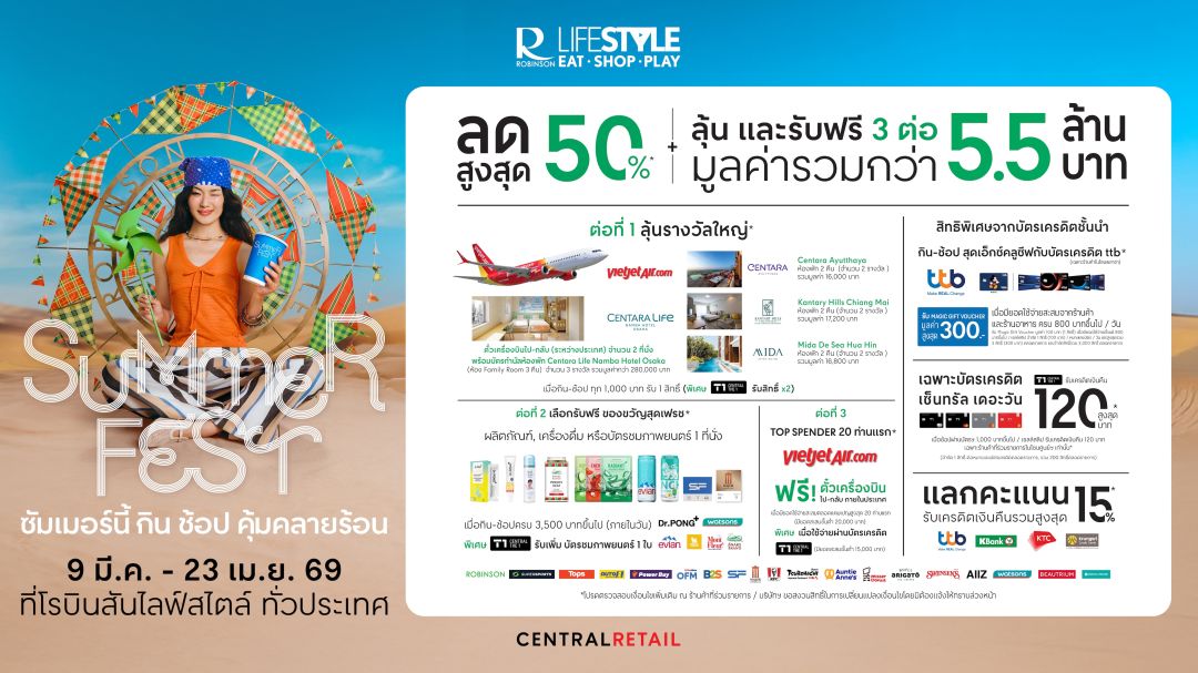 ต้อนรับความสนุกในซัมเมอร์กับแคมเปญ ‘Robinson Lifestyle Summer Fest ซัมเมอร์นี้ กิน ช้อป คุ้ม คลายร้อน’ ที่พร้อมมอบทั้งความคุ้มค่า ความสุข และสีสันของฤดูร้อน ตั้งแต่วันที่ 9 มี.ค. 69 – 23 เม.ย. 69 ณ ณ ศูนย์การค้าโรบินสันไลฟ์สไตล์ทั่วประเทศ