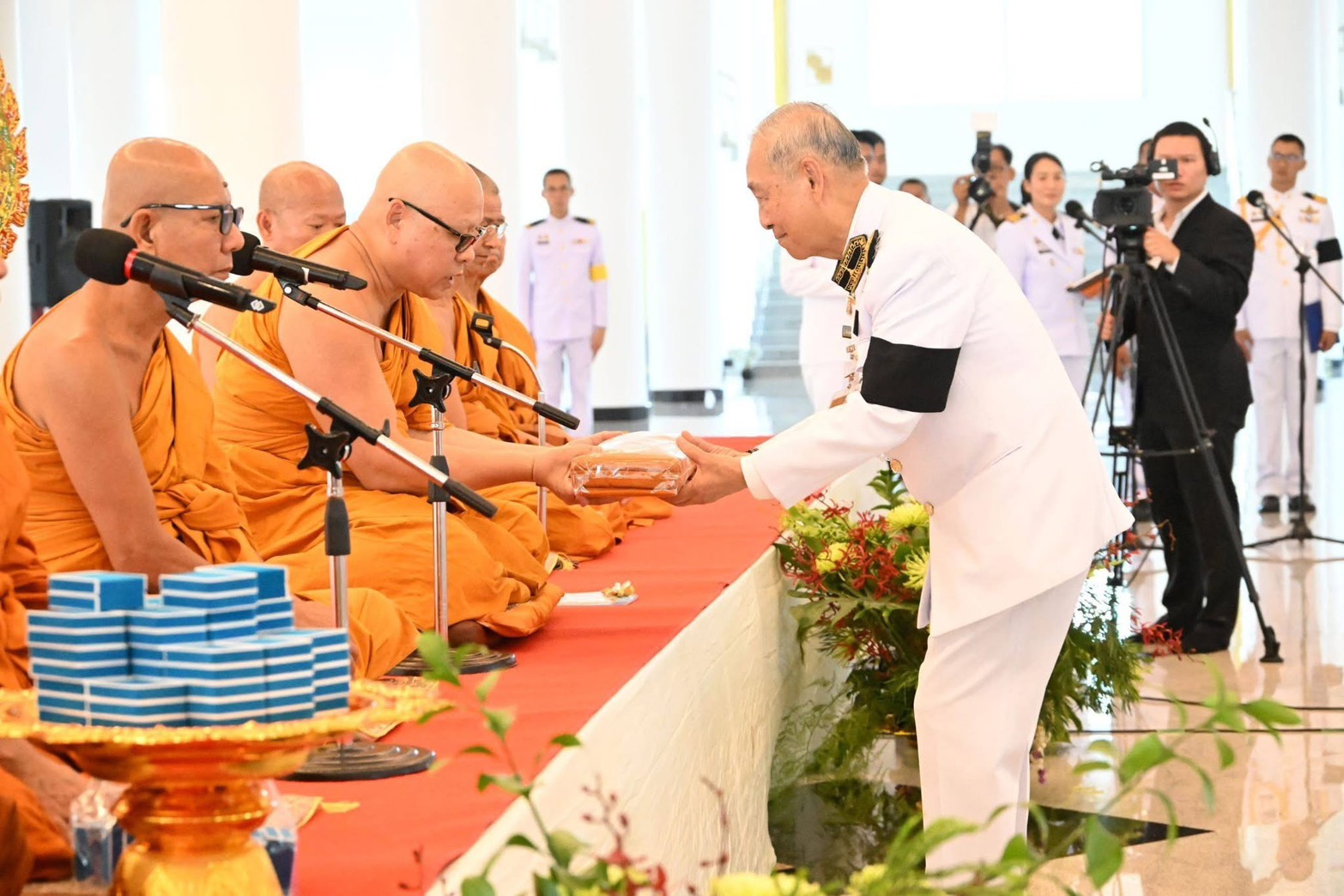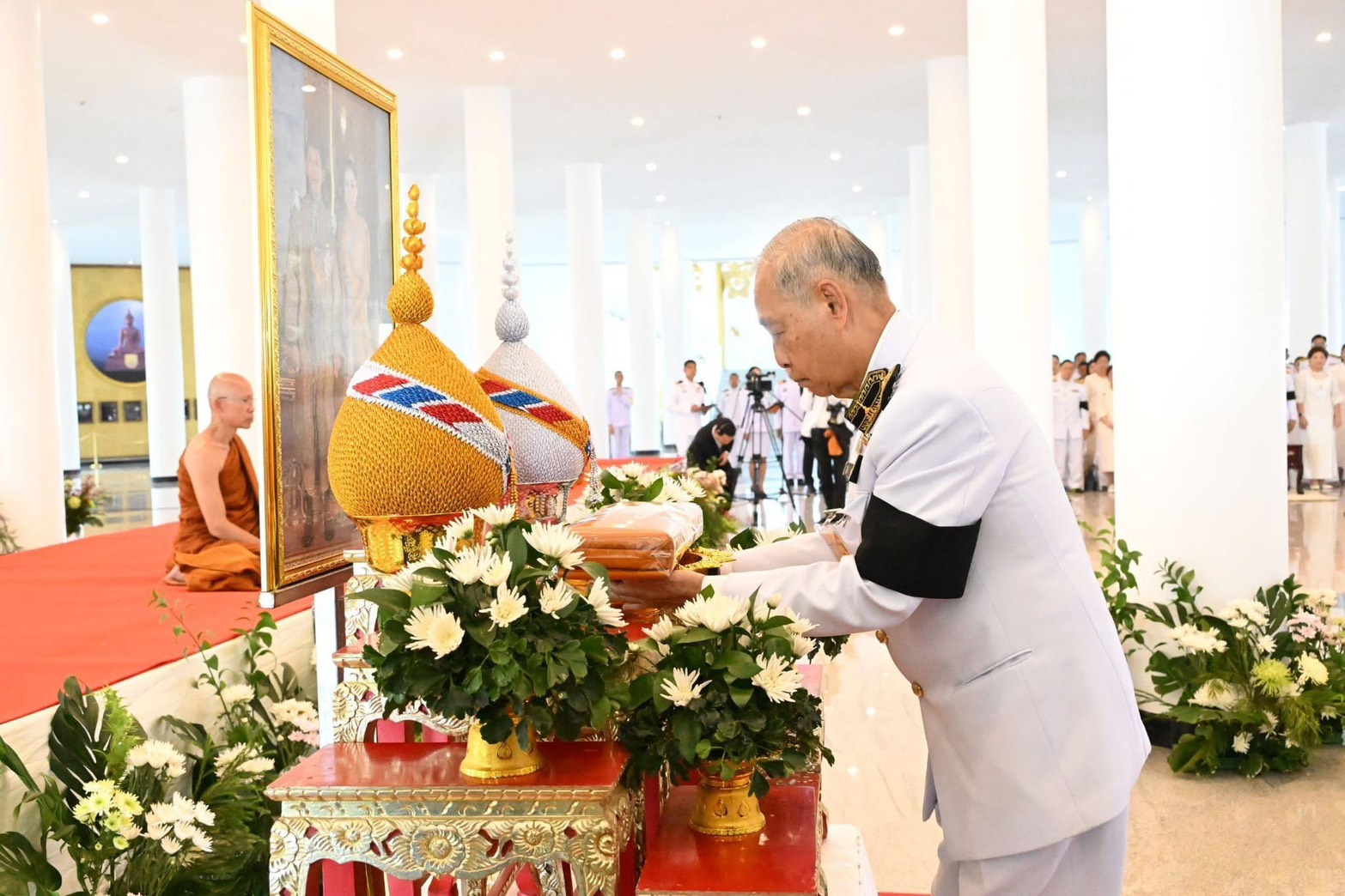 พล.อ.อ.ชลิต พุกผาสุข องคมนตรี ประธานโครงการ และประธานพิธีรับผ้าไตรพระราชทานเบื้องหน้าพระบรมฉายาลักษณ์