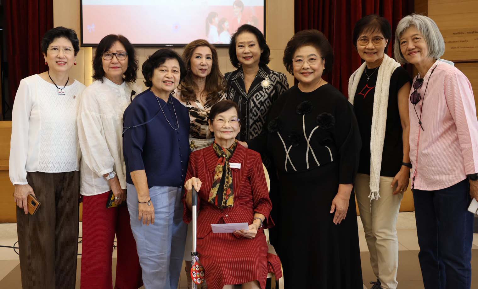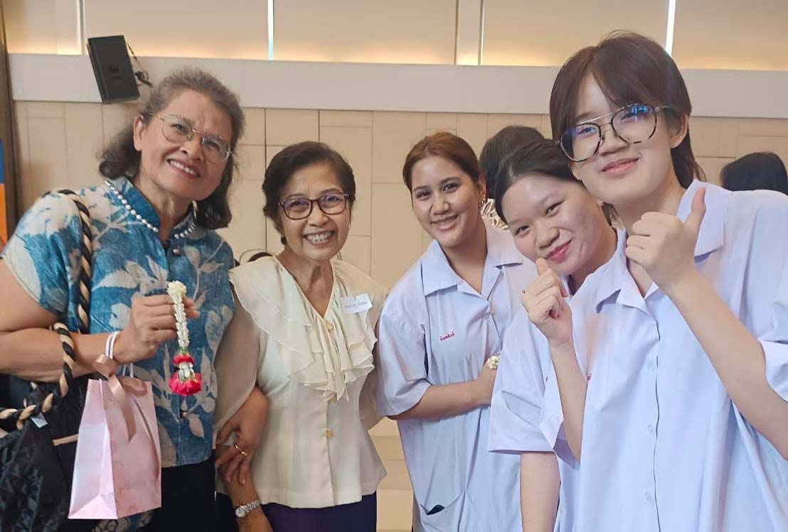 อ.สมศรี เย็นภิญโญ กับลูกศิษย์ร่นุใหญ่ ดร.ณ ฤดี เคียงศิริ อดีตนายก ส.ว.ว., ลานทิพย์ ทวาทศิน ผจก.รร.วัฒนาวิทยาลัย ศจ.ดร.แพง ชินพงศ์ และ ธนิดา ฤทธาคนี