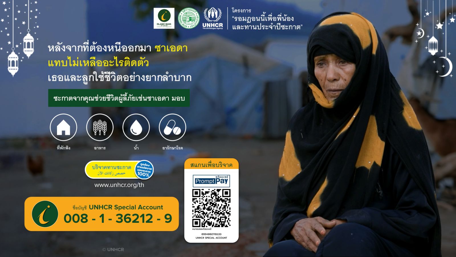 ในเดือนรอมฎอนอันศักดิ์สิทธิ์นี้ ทุกท่านสามารถแบ่งปันพื้นที่ความโอบอ้อมอารีเพื่อผู้ลี้ภัยกับครอบครัวผู้ลี้ภัยและผู้พลัดถิ่นจากสงครามและความรุนแรงทั่วโลก ผ่านกิจกรรมตลอดเดือนรอมฎอนอันศักดิ์สิทธิ์นี้ โดยร่วมส่งกำลังใจและสนับสนุน Content Creator ในการประกวด “ครีเอเตอร์ผู้สร้างความเปลี่ยนแปลงด้านมนุษยธรรมโลก” ภายใต้โครงการ “รอมฎอนนี้เพื่อพี่น้องและทานประจำปีซะกาต ปีที่ 9” สามารถร่วมบริจาคทานซะกาตเพื่อผู้ลี้ภัยกับ UNHCR https://donate.unhcr.org/th/th/zakat และสามารถบริจาคได้ที่ ชื่อบัญชี UNHCR Special Account ธนาคารอิสลามแห่งประเทศไทย เลขที่บัญชี 008-1-36212-9 และบริจาคทานซะกาตเพื่อช่วยเหลือพี่น้องผู้ยากไร้ในประเทศไทยกับธนาคารอิสลามแห่งประเทศไทย ชื่อบัญชี บัญชีซะกาตธนาคารอิสลามแห่งประเทศไทย เลขที่บัญชี 001-1-03879-9