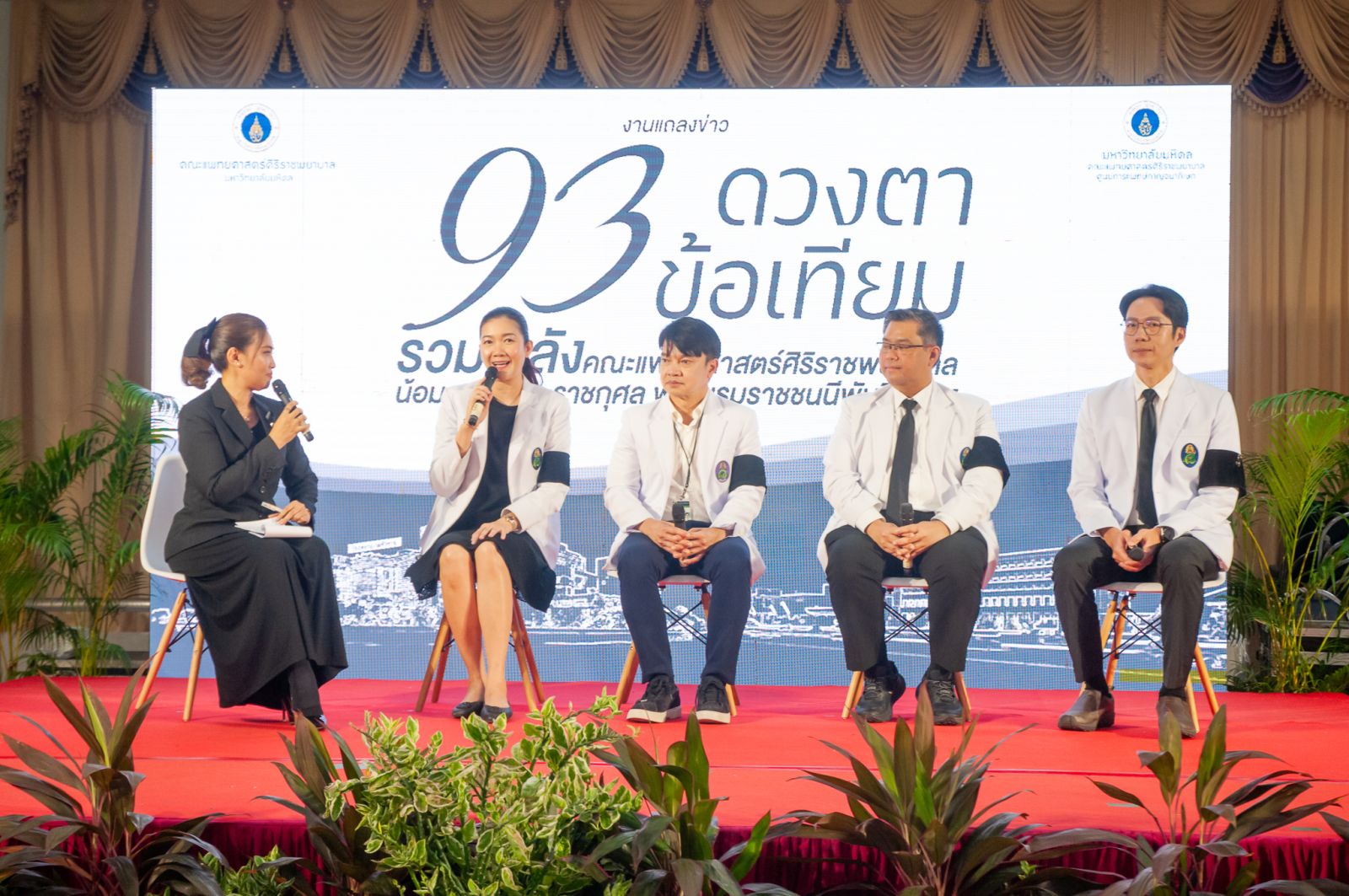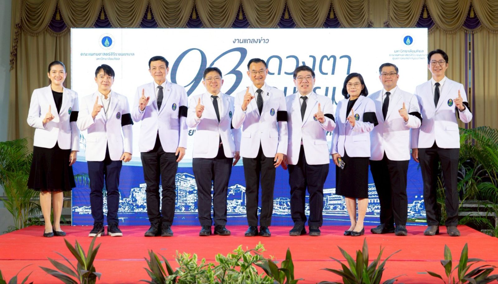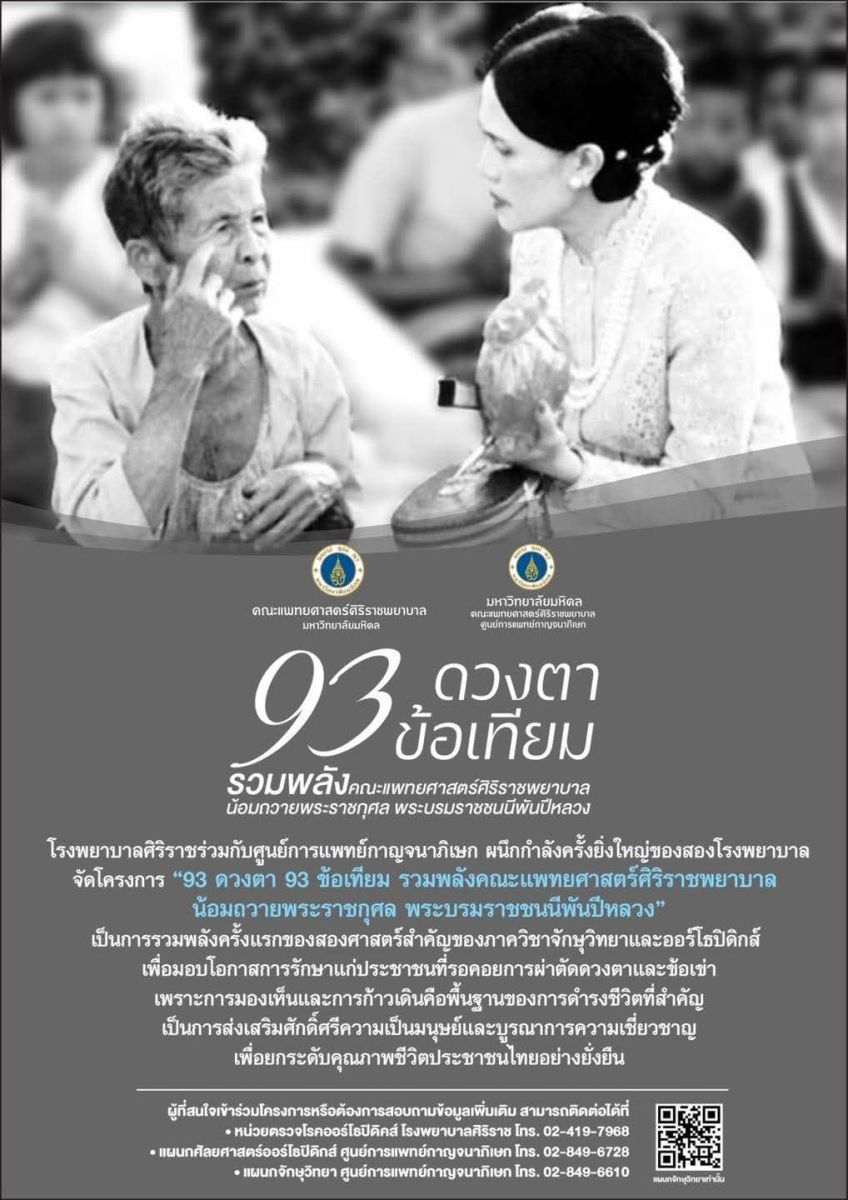 93 โรงพยาบาลศิริราช และศูนย์การแพทย์กาญจนาภิเษก คณะแพทยศาสตร์ศิริราชพยาบาล มหาวิทยาลัยมหิดล ผนึกกำลังครั้งยิ่งใหญ่ จัดแถลงข่าวโครงการ “93 ดวงตา 93 ข้อเทียม รวมพลังคณะแพทยศาสตร์ศิริราชพยาบาล น้อมถวายพระราชกุศลแด่ สมเด็จพระนางเจ้าสิริกิติ์พระบรมราชินีนาถ พระบรมราชชนนีพันปีหลวง” ภารกิจผ่าตัดต้อกระจก 93 ดวงตา และเปลี่ยนข้อเข่า – ข้อสะโพกด้วยหุ่นยนต์ช่วยผ่าตัด จำนวน 93 ข้อ ช่วยเหลือผู้สูงอายุด้อยโอกาส เพื่อยกระดับคุณภาพชีวิตของผู้ป่วย ให้สามารถเข้าถึงการรักษาถวายเป็นพระราชกุศล เมื่อวันที่ 10 มีนาคม ณ ศาลาศิริราช 100 ปี โรงพยาบาลศิริราช