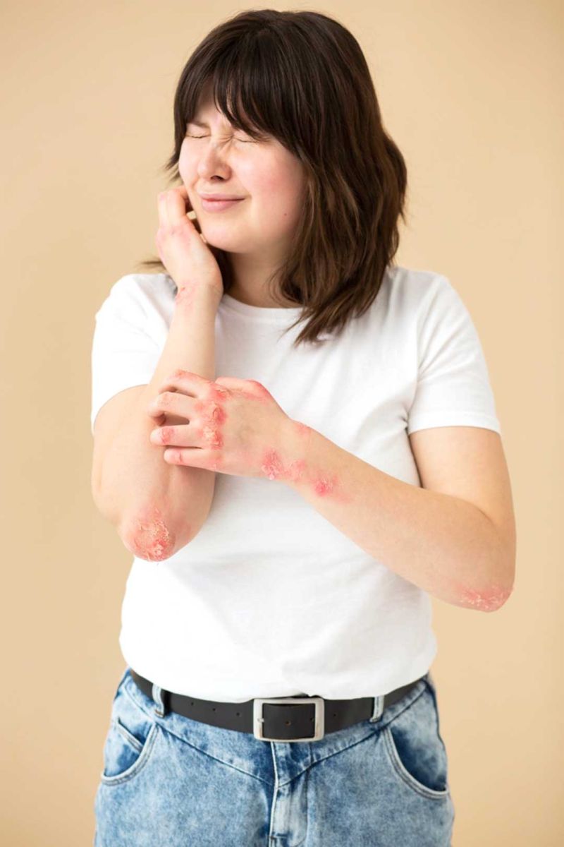 ผิวที่บางลง แสบร้อน หรือระคายเคืองง่าย อาจเกิดจากการใช้ยาหรือผลิตภัณฑ์ที่แรงเกินไปสำหรับสภาพผิวหรือใช้ต่อเนื่องโดยไม่ได้ปรับให้เหมาะสม ผิวที่ถูกกระตุ้นมากเกินไปจะทำให้เกราะป้องกันผิวสูญเสียความแข็งแรง และอาจทำให้อาการสะเก็ดเงินรักษาได้ยากขึ้น การรักษาสะเก็ดเงินจึงควรคำนึงถึงผลลัพธ์และความปลอดภัยไปพร้อมกัน