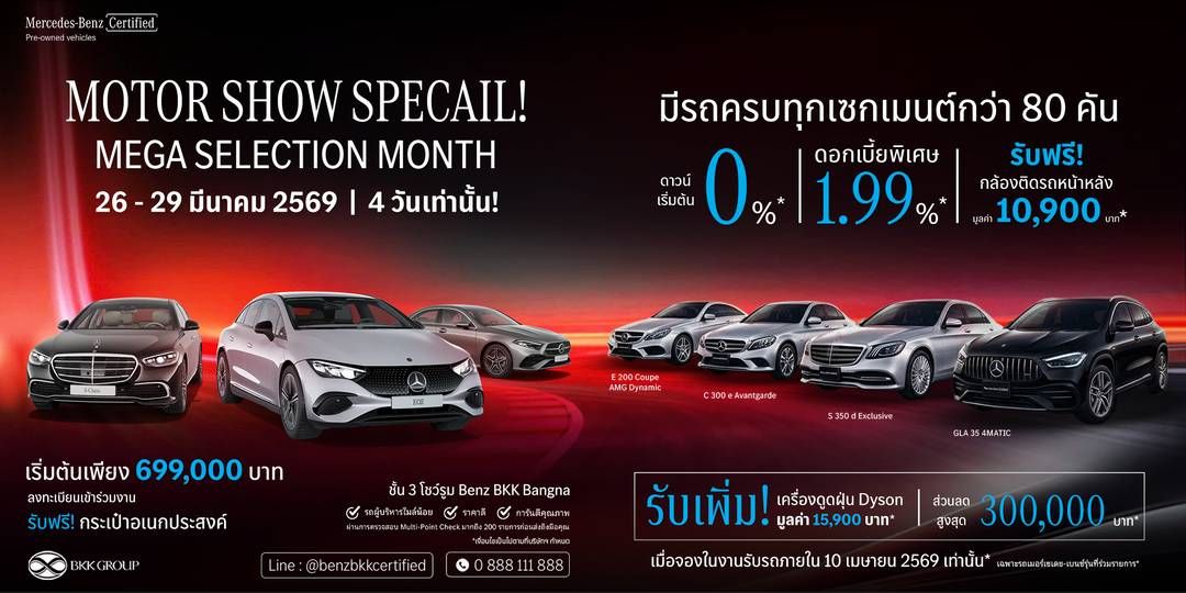 Benz BKK Group-Bangna ผู้แทนจำหน่ายและศูนย์บริการรถยนต์ Mercedes-Benz อย่างเป็นทางการ เปิดตัวแคมเปญ “MOTOR SHOW SPECIAL!” ภายใต้ไลน์ Mercedes-Benz Certified by Benz BKK Bangna เพื่อตอบรับช่วงเวลาสำคัญของอุตสาหกรรมยานยนต์อย่าง Motor Show ซึ่งเป็นช่วงที่ผู้บริโภคมีความต้องการและความพร้อมในการตัดสินใจสูง โดยนำเสนอข้อเสนอพิเศษสำหรับลูกค้าที่ต้องการเป็นเจ้าของรถยนต์เมอร์เซเดส-เบนซ์คุณภาพระดับพรีเมียม ในราคาที่เข้าถึงได้ พร้อมมาตรฐานการรับรองจากเมอร์เซเดส-เบนซ์ โดยงานจะจัดขึ้นระหว่างวันที่ 26 – 29 มีนาคม 2569 ณ ชั้น 3 โชว์รูม Benz BKK Bangna