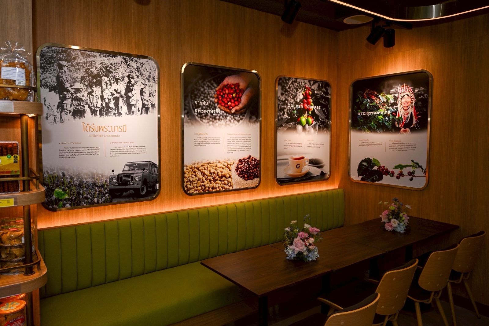 ทั้งนี้ นางนวลพรรณ ล่ำซำ กรรมการ บริษัท สุวรรณชาด จำกัด ในพระบรมราชูปถัมภ์ กล่าวว่า ร้านโกลเด้น คอฟฟี่ สาขา อาคารเมืองไทย - ภัทร คอมเพล็กซ์ ได้เริ่มทดลองเปิดให้บริการแก่ประชาชน พนักงานออฟฟิศ ผู้คนวัยทำงาน มาตั้งแต่วันที่ 20 กุมภาพันธ์ 2569 โดยมีพื้นที่ให้บริการราวๆ 58 ตารางเมตร ให้บริการกาแฟ และเครื่องดื่มประเภทต่างๆ ที่มีรสชาติเป็นเอกลักษณ์เฉพาะตัว ด้วยส่วนผสมหลักจากโครงการหลวง อาทิ เมล็ดกาแฟจากโครงการหลวง น้ำผลไม้เข้มข้น และน้ำผึ้งจากดอยคำ ภายในร้านยังจำหน่ายสินค้า โอท็อปจากกลุ่มแม่บ้านเกษตรกร รวมถึงเบเกอรี่ ขนมไทยโบราณ และอาหารพร้อมทาน เช่น สลัดโรล ก๋วยเตี๋ยวลุยสวน แซนวิส ข้าวคลุกกะปิ ผลไม้พร้อมทานฯ นอกจากผลิตผลจากโครงการหลวงแล้ว โกลเด้น คอฟฟี่ ยังเลือกสรรส่วนผสมที่มีคุณภาพ เพื่อพัฒนารสชาติของเครื่องดื่มทุกเมนูให้เหมาะสมกับลูกค้าทุกกลุ่ม แต่ยังคงเอกลักษณ์ของความเป็น “โกลเด้น คอฟฟี่”