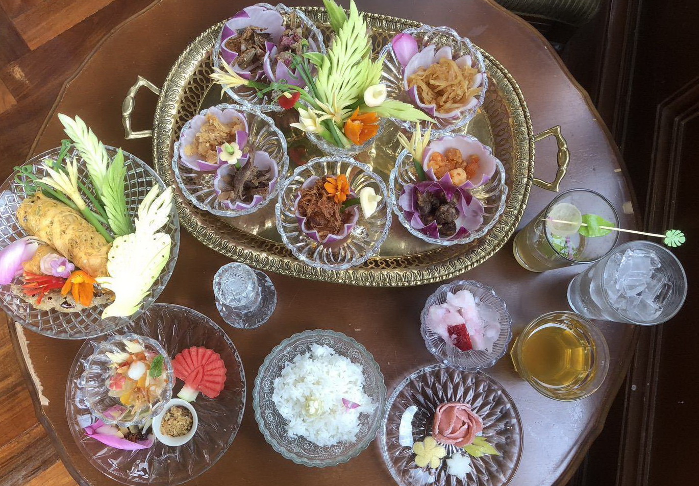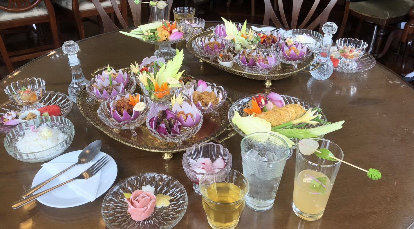 สำรับ “ข้าวแช่ แลวัง” ประกอบด้วย ชุดรับรองชมวัง :เมี่ยงคำสมอกลีบบัว, ยำส้มฉุน, น้ำมะกรูดสมุนไพรหอม, สำรับข้าวแช่ : ลูกกะปิ ปลายี่สน ผัด ไชโป๊วผัดแก้วน้ำผึ้ง หัวหอมยัดไส้ปลาช่อน พริกหยวกยัดไส้หมูหอมพันไข่หรุ่ม กระทงหอมเครื่องน้ำพริกหวาน ปลาขาวเขื่อนสิริธรชุบทอด ไข่ห่อกระเทียมดอง กะพงพริกเหลือง พริกแห้งสอดไส้ ปลาผัดมะพร้าว กระฉีกงานหอม, สำรับเครื่องหวาน : ชมพู่ลอยเกล็ดแก้ว จีบกลีบดอกไม้ถั่วขาว ไส้ แมคคาเดเมีย กะทิสด ชาสาลี่หอมน้ำผึ้งดอกไม้ป่า