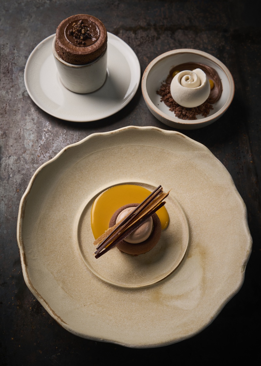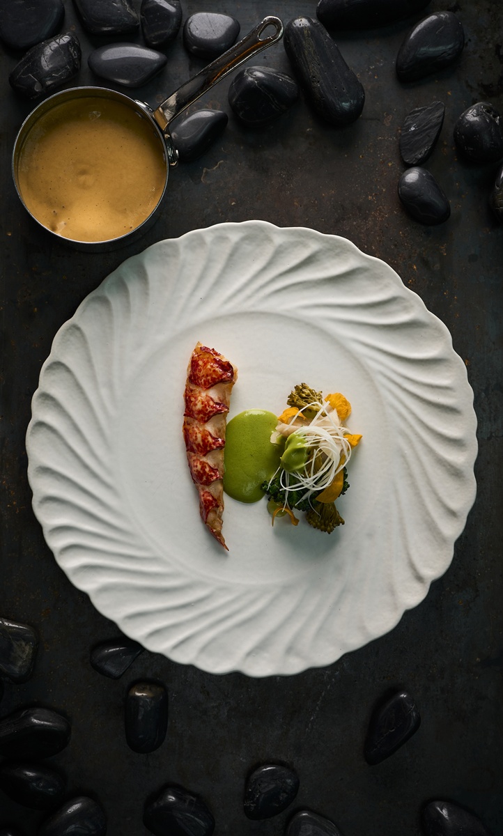 สามจานหลักที่ทำหน้าที่เป็นตัวแทนอัตลักษณ์ด้านอาหารของ Duet ได้แก่ Alaskan King Crab จับคู่กับคาเวียร์ Shadi Schrenki โดดเด่นด้วยไข่มุกที่ให้สัมผัสของครีมสดและความเค็มกลิ่นอายทะเล พร้อมกลิ่นหอมอ่อน ๆ ของวานิลลาและมะกรูดที่ช่วยสร้างสมดุลของกลิ่นรส, Brittany Blue Lobster เมนูที่อยู่ในรายการของ Duet ตั้งแต่วันแรกที่เปิดบริการ เสิร์ฟคู่กับ épicéa หรือสนสปรูซที่ตีความให้มีกลิ่นรสคล้ายซิตรัส ให้โน้ตของผิวมะนาวและเรซินอ่อน ๆ เสริมด้วยซอส Homardine Sabayon และความสดของผักตระกูล Brassica และ Normandy Scallop หอยเชลล์จากนอร์มังดีย่างเหนือถ่านอย่างนุ่มนวล เสิร์ฟกับดอกกะหล่ำและซอส X.O. ที่ผ่านการเคี่ยววัตถุดิบทะเลแห้งอย่างช้า ๆ ให้รสลึกซึ้ง ก่อนปิดท้ายด้วยไวน์เหลืองจากแคว้นจูรา ฝรั่งเศส
