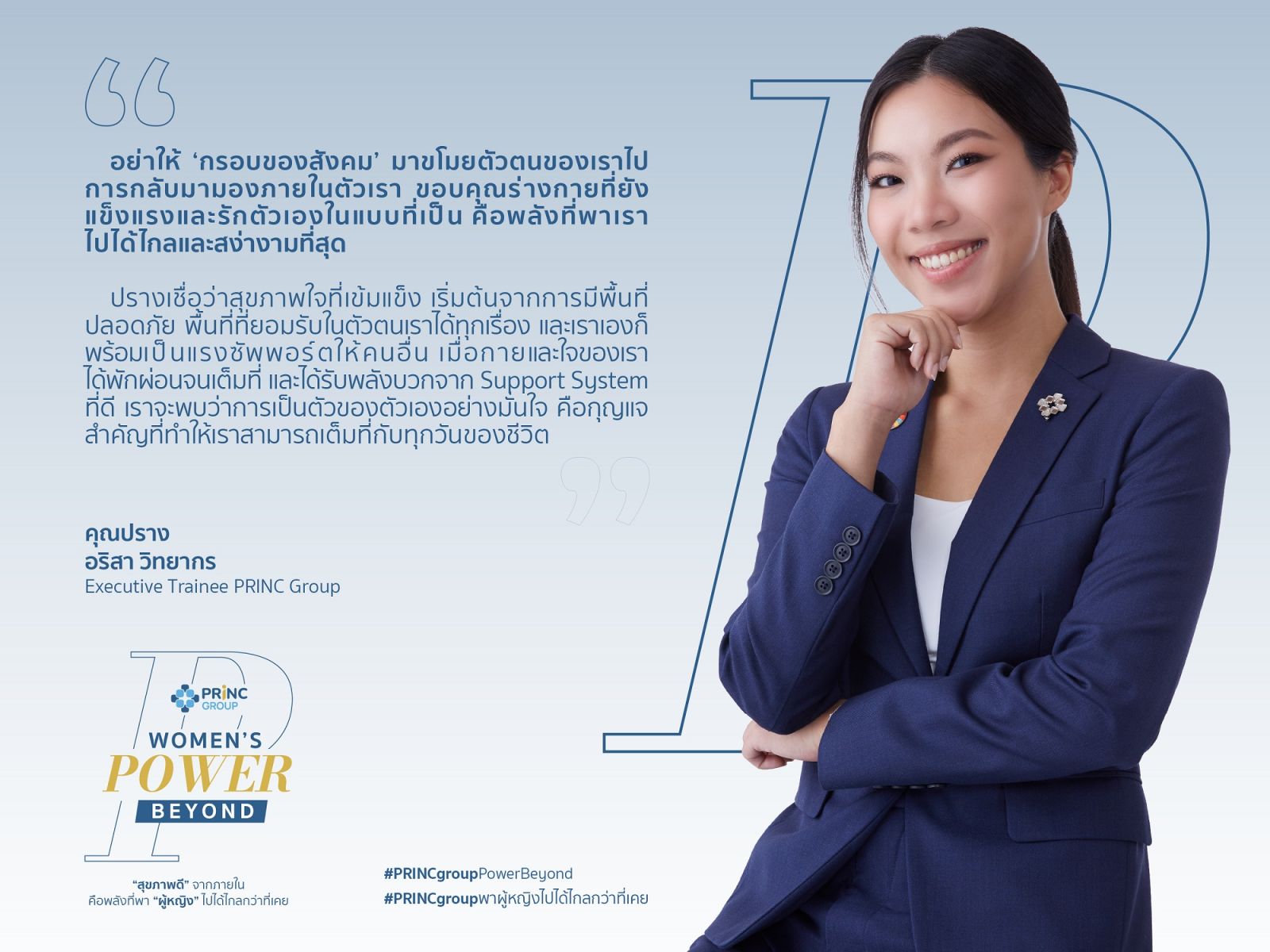 อริสา วิทยากร Executive Trainee บริษัท พริ้นซิเพิล แคปิตอล จำกัด (มหาชน) หรือ PRINC Group กล่าวว่า “สำหรับคุณปราง การเติบโตไม่ได้เริ่มจากการพยายามเป็นใคร แต่เริ่มจากการกลับมาเข้าใจและยอมรับตัวเองในแบบที่เป็น และเชื่อว่าสุขภาพใจที่แข็งแรง คือพื้นฐานสำคัญของการใช้ชีวิต เพราะเมื่อเรามีพื้นที่ปลอดภัยให้ตัวเอง ได้พัก ได้ฟัง และได้ยอมรับความรู้สึกของตัวเองอย่างแท้จริง เราจะสามารถก้าวไปข้างหน้าได้อย่างมั่นคง ซึ่งการเป็นตัวของตัวเอง ไม่ใช่การต่อต้านกรอบของสังคม แต่คือการเลือกยืนอยู่ในแบบที่เราสบายใจ และมั่นใจในคุณค่าของตัวเอง