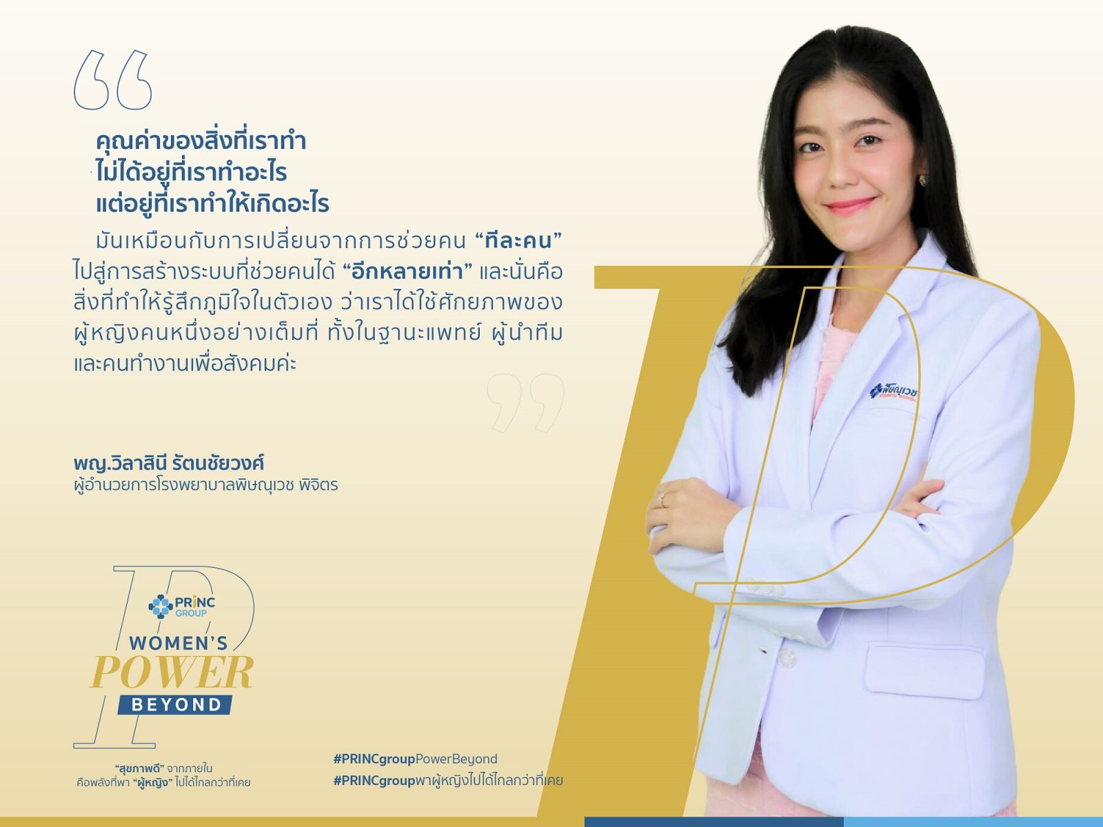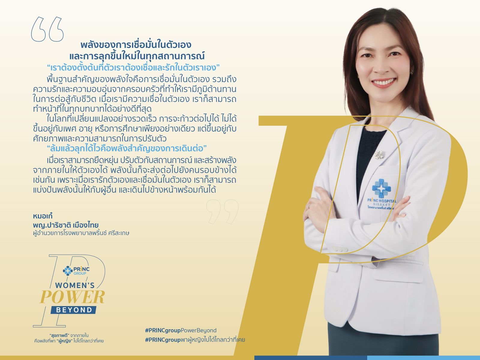 พญ. ปาริชาติ เมืองไทย ผู้อำนวยการโรงพยาบาลพริ้นซ์ ศรีสะเกษ กล่าวว่า “ก่อนจะก้าวมาสู่บทบาทผู้อำนวยการโรงพยาบาล หมอเก๋ผ่านการทำงานในหลายบทบาท ทั้งแพทย์เวชศาสตร์ครอบครัว และแพทย์ดูแลผู้ป่วยแบบประคับประคองประสบการณ์เหล่านี้ทำให้เข้าใจทั้งมิติของการรักษาและมิติของชีวิต สำหรับหมอเก๋ พลังสำคัญของผู้หญิงในโลกการทำงานวันนี้ ไม่ได้ขึ้นอยู่กับเพศ อายุ หรือการศึกษาเพียงอย่างเดียว แต่คือ ความเชื่อมั่นในตัวเอง และความสามารถในการลุกขึ้นใหม่เมื่อเผชิญกับความเปลี่ยนแปลง เมื่อเราสร้างพลังจากภายในให้ตัวเองได้ พลังนั้นก็สามารถส่งต่อไปยังผู้คนรอบข้างได้เช่นกัน เพราะทีมที่แข็งแรงไม่ได้เกิดจากความเหมือนกันทั้งหมด แต่เกิดจากการยอมรับ ความแตกต่างของความคิด เพศ และช่วงวัย เพื่อสร้างการทำงานที่เติบโตไปด้วยกัน”