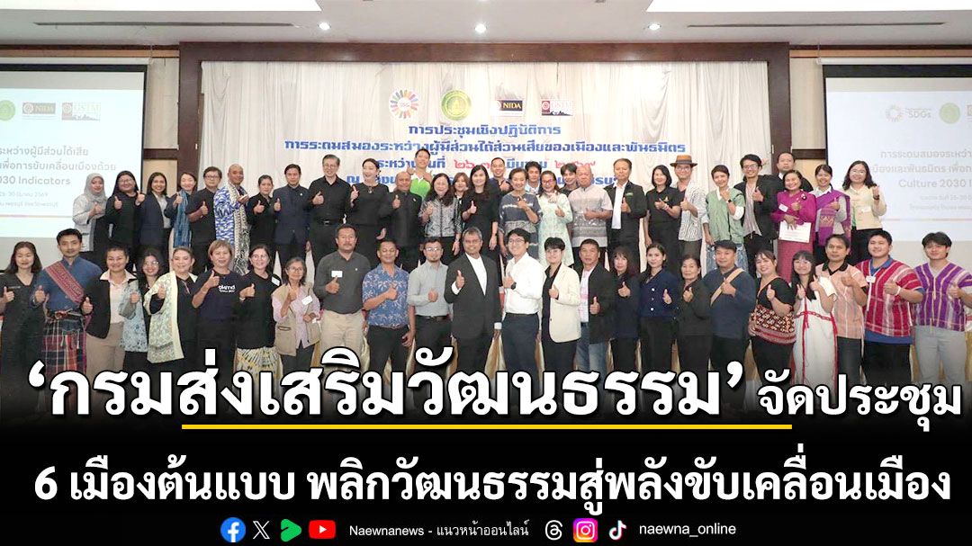 กรมส่งเสริมวัฒนธรรม กระทรวงวัฒนธรรม เดินหน้าขับเคลื่อนการพัฒนาเมืองไทยสู่ความยั่งยืน ผ่านโครงการ Thailand Culture 2030 โดยจัดการประชุมเชิงปฏิบัติการ การระดมสมองระหว่างผู้มีส่วนได้ส่วนเสียของเมืองและพันธมิตร เพื่อการขับเคลื่อนเมืองด้วย Culture 2030 Indicators ระหว่างวันที่ 26 – 30 มีนาคม 2569 ณ จังหวัดเพชรบุรี เพื่อเสริมศักยภาพเมืองต้นแบบในการนำ “วัฒนธรรม” มาเป็นกลไกสำคัญในการพัฒนาเมือง ให้สอดคล้องกับเป้าหมายการพัฒนาที่ยั่งยืน (SDGs)