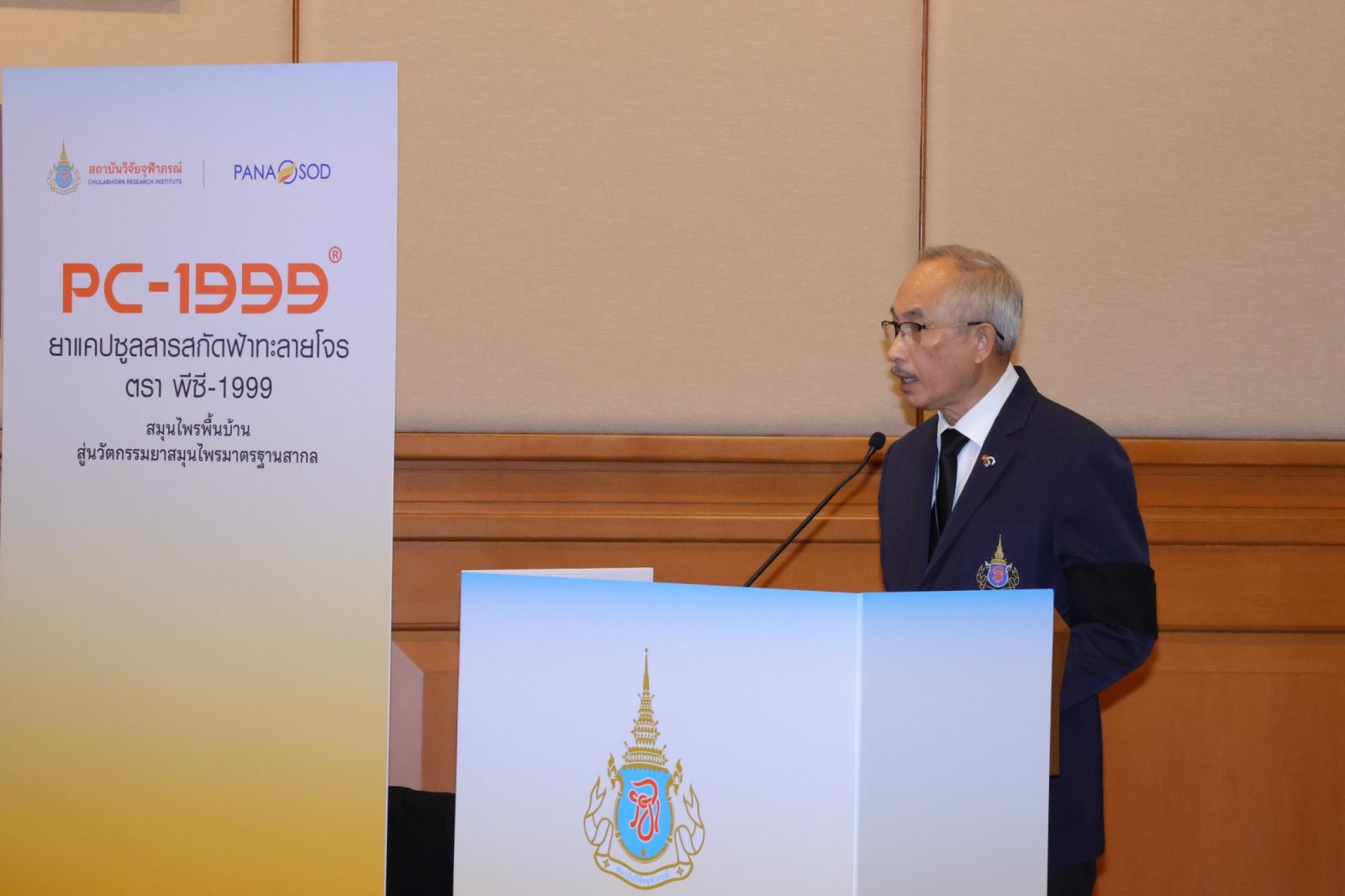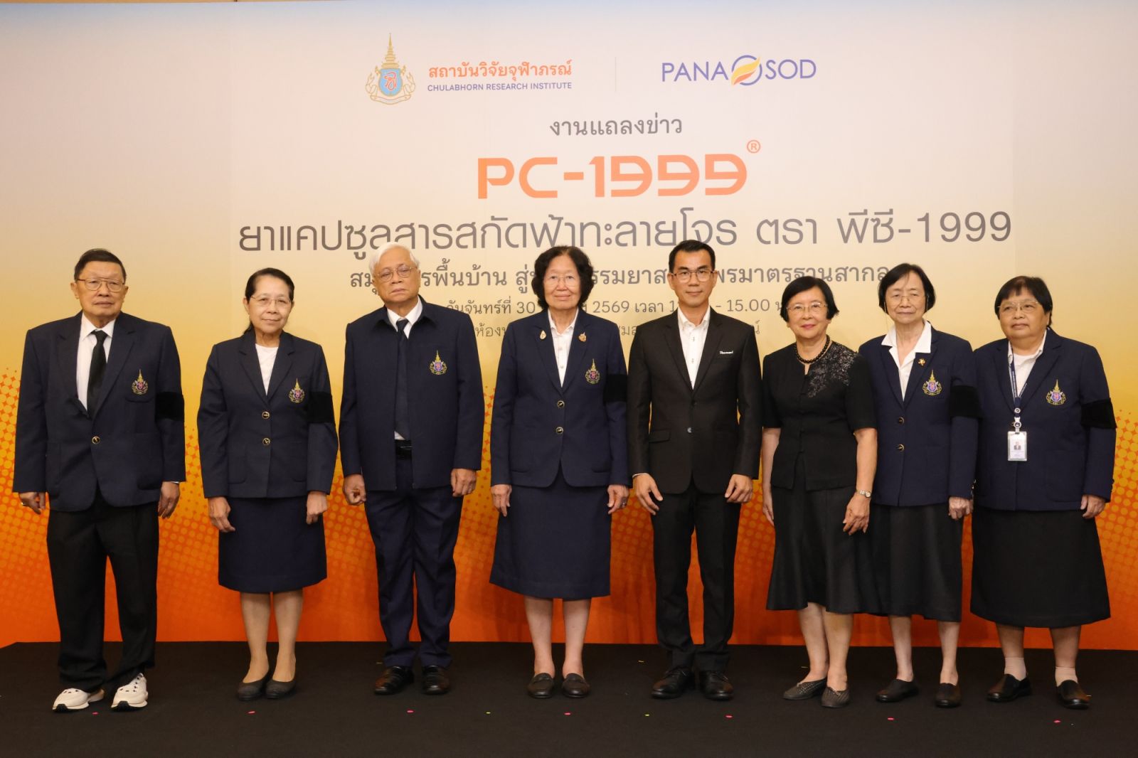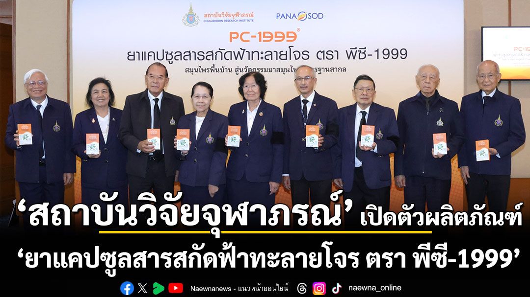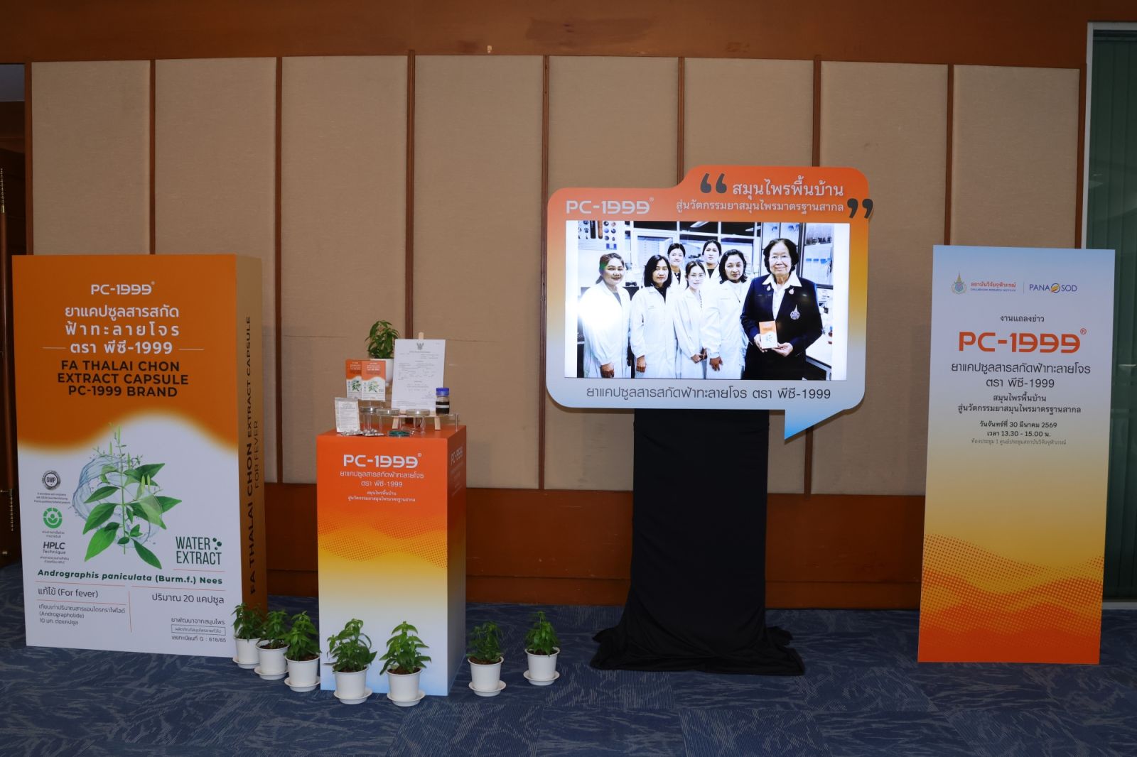 สถาบันวิจัยจุฬาภรณ์ ร่วมกับ บริษัท ปานะโอสถ จำกัด จัดงานแถลงข่าวเปิดตัวผลิตภัณฑ์ “ยาแคปซูลสารสกัดฟ้าทะลายโจร ตรา พีซี-1999” (PC-1999) นวัตกรรมจากสมุนไพรไทย เพื่อใช้บรรเทาอาการไข้ โดยมีรองศาสตราจารย์ ดร.ชูศักดิ์ ลิ่มสกุล รองประธานสถาบันวิจัยจุฬาภรณ์ ฝ่ายบริหารและอาคารสถานที่ เป็นประธานในพิธีฯ พร้อมด้วยคณะผู้บริหารสถาบันวิจัยจุฬาภรณ์ คณะผู้บริหารบริษัท ปานะโอสถ จำกัด เข้าร่วม ณ ห้องประชุม 1 ศูนย์ประชุมสถาบันวิจัยจุฬาภรณ์