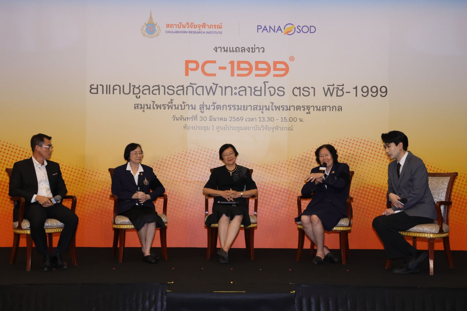 ภายในงานมีการจัดเสวนาในหัวข้อ “ทำไมต้องเป็นฟ้าทะลายโจร PC-1999” โดยมี รองศาสตราจารย์ ดร.เภสัชกรหญิงจุฑามาศ สัตยวิวัฒน์ รองประธานสถาบันวิจัยจุฬาภรณ์ ฝ่ายธุรการวิทยาศาสตร์ และผู้อำนวยการห้องปฏิบัติการวิจัยเภสัชวิทยา ศาสตราจารย์เกียรติคุณ แพทย์หญิงสยมพร ศิรินาวิน อาจารย์ประจำสาขาวิชาโรคติดเชื้อ คณะแพทยศาสตร์โรงพยาบาลรามาธิบดี มหาวิทยาลัยมหิดล รองศาสตราจารย์ ดร.ดวงจิตต์ พนมวัน ณ อยุธยา ที่ปรึกษาหน่วยวิจัยเพื่อการประยุกต์ใช้ สถาบันวิจัยจุฬาภรณ์ และ พิษณุ อุชุวัฒน์ กรรมการผู้จัดการบริษัท ปานะโอสถ จำกัด ร่วมถ่ายทอดแนวคิดกระบวนการวิจัยและการพัฒนาจากห้องปฏิบัติการสู่การถ่ายทอดเทคโนโลยีการผลิตสารสกัดและเทคโนโลยีการผลิตต้นแบบของผลิตภัณฑ์มาตรฐานฟ้าทะลายโจรแก่ภาคอุตสาหกรรมเพื่อมุ่งเน้นการยกระดับนวัตกรรม และสามารถเพิ่มมูลค่าผลิตภัณฑ์ฯ ในเชิงพาณิชย์ได้ นอกจากนี้ ยังมีการนำเสนอวีดิทัศน์แนะนำผลิตภัณฑ์ฯ พร้อมความเป็นมาของการดำเนินโครงการพัฒนาผลิตภัณฑ์ PC-1999 ที่มีมาอย่างต่อเนื่อง