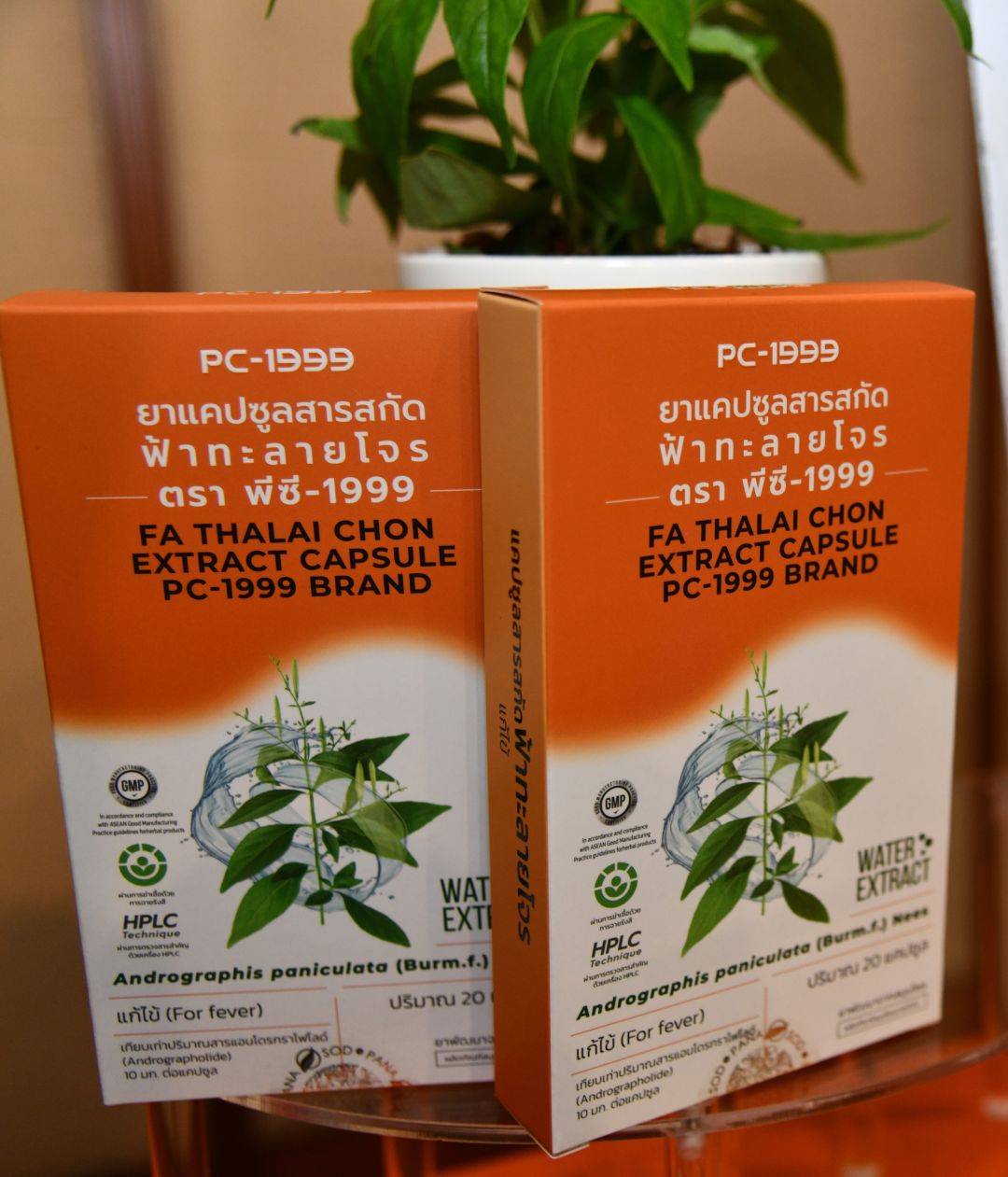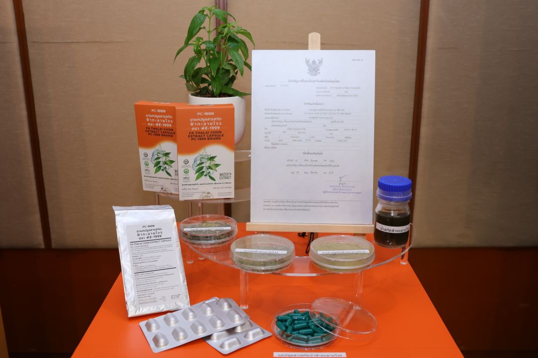 สถาบันวิจัยจุฬาภรณ์ เป็นหน่วยงานแห่งแรกของประเทศไทย ที่ทำการพัฒนาและผลิตสารสกัดฟ้าทะลายโจรโดยการใช้ “น้ำ” เป็นตัวทำละลายในการสกัด โดยได้พัฒนาและต่อยอดจากองค์ความรู้ดั้งเดิมของการแพทย์แผนไทย ในการต้มยาสมุนไพรด้วยน้ำ และได้พัฒนาวิธีการสกัดดังกล่าวให้เหมาะสม เพื่อให้ได้สารสกัดที่มีปริมาณสารออกฤทธิ์หลัก Andrographolide ตามที่ต้องการ ซึ่งกระบวนการสกัดด้วยน้ำ ยังช่วยลดต้นทุนการผลิตเมื่อเทียบกับการสกัดด้วยแอลกอฮอล์ อีกด้วย ทั้งนี้ สถาบันวิจัยจุฬาภรณ์ ได้จดอนุสิทธิบัตรกรรมวิธีการเตรียมสารสกัดน้ำ จำนวน 2 ฉบับ และยังได้พัฒนาวิธีวิเคราะห์สารออกฤทธิ์ในฟ้าทะลายโจรที่สำคัญพร้อมกัน 4 ชนิด ได้แก่ Andrographolide (AP1), 14-Deoxy-11, 12-didehydroandrographolide (AP3), Neoandrographolide (AP4) และ14-deoxyandrographolide (AP6) เพื่อนำมาใช้ในการควบคุมปริมาณสารสำคัญในฟ้าทะลายโจร และได้สารสำคัญที่ออกฤทธิ์ โดยเฉพาะ Andrographolide ให้ได้มากที่สุด จนสามารถนำไปสู่การพัฒนาเป็นผลิตภัณฑ์ “ยาแคปซูลสารสกัดฟ้าทะลายโจร ตรา พีซี-1999 (PC-1999)” ที่มีปริมาณสารสกัด 230 มิลลิกรัมต่อแคปซูล เทียบเท่าสารสำคัญ Andrographolide 10 มิลลิกรัม ซึ่งการศึกษาการละลายของสารสำคัญจากผลิตภัณฑ์ (Dissolution testing) พบว่า พืชสมุนไพรฟ้าทะลายโจรสามารถละลายได้ดีมากด้วยเทคโนโลยีการสกัดด้วยน้ำ ทำให้ปลดปล่อยสารสำคัญได้อย่างมีประสิทธิภาพ และถูกดูดซึมเข้าสู่ร่างกายได้ดีอีกด้วย ทั้งนี้ มีผลงานวิจัยของคณะผู้วิจัยจากสถาบันวิจัยจุฬาภรณ์ที่ได้รับการตีพิมพ์ในวารสารชั้นนำระดับนานาชาติ ตั้งแต่ปี พ.ศ. 2547 จนถึงปัจจุบัน รวม 18 เรื่อง และได้รับรางวัลผลงานวิจัยแห่งชาติ ประจำปีงบประมาณ พ.ศ. 2567 ในระดับ “ดีมาก” จากสำนักงานการวิจัยแห่งชาติ (วช.) ในหัวข้อ “ฟ้าทะลายโจร: จากงานวิจัยพื้นฐานสู่การประยุกต์ใช้”