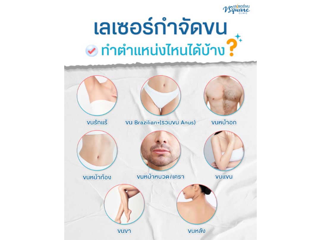 เลเซอร์ขนสามารถทำได้หลายตำแหน่งทั่วร่างกายที่มีปัญหาเส้นขนส่วนเกิน โดยตำแหน่งที่นิยมทำเลเซอร์ขน ได้แก่