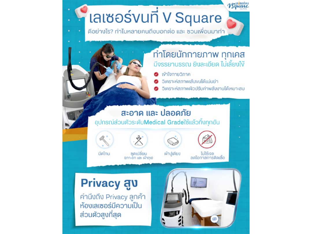 การทำเลเซอร์ขนให้เห็นผลดีและปลอดภัย ควรอยู่ภายใต้การดูแลของผู้เชี่ยวชาญและใช้เครื่องเลเซอร์ที่เหมาะสมกับสภาพผิวและลักษณะเส้นขนของแต่ละบุคคล ที่ V Square Clinic มีการออกแบบโปรแกรมเลเซอร์ขนให้ครอบคลุมทั้งเรื่องประสิทธิภาพ ความสะอาด และความสะดวกในการเข้ารับบริการ โดยมีจุดเด่นดังนี้