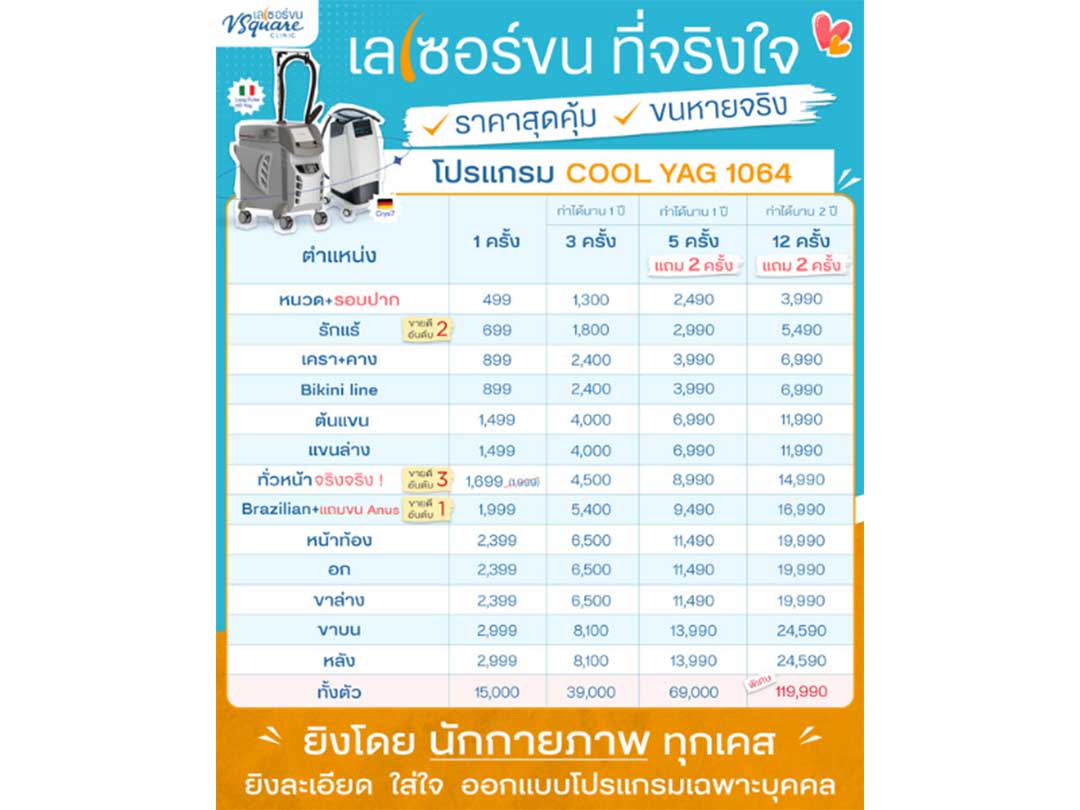 เลเซอร์ขน ราคาเริ่ม 499.-/ครั้ง มั่นใจขนหายถาวร ด้วยเครื่องเลเซอร์กำจัดขน พรีเมียม โปรแกรม Cool Yag 1064 นำเข้าจากอิตาลี และเยอรมัน มาตรฐาน US FDA ที่ V Square Clinic