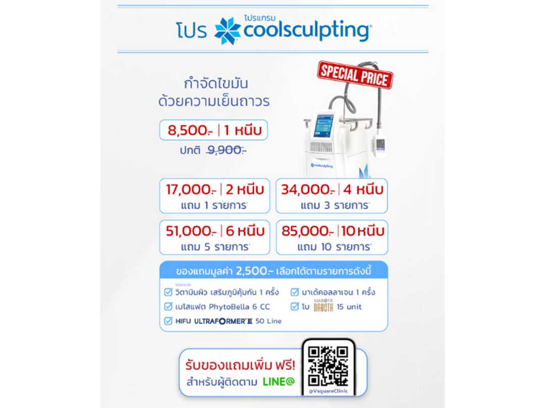 ที่ V Square Clinic มีโปรแกรม CoolSculpting ราคาโปรโมชั่น สำหรับผู้ที่ต้องการสลายไขมันเฉพาะจุดด้วยความเย็น โดยมีราคาเริ่มต้นที่ 8,500.-/ 1 หนีบ พร้อมสิทธิ์เลือกของแถมมูลค่า 2,500 บาท ตามเงื่อนไขของคลินิก เพื่อเพิ่มความคุ้มค่าในการเข้ารับบริการ