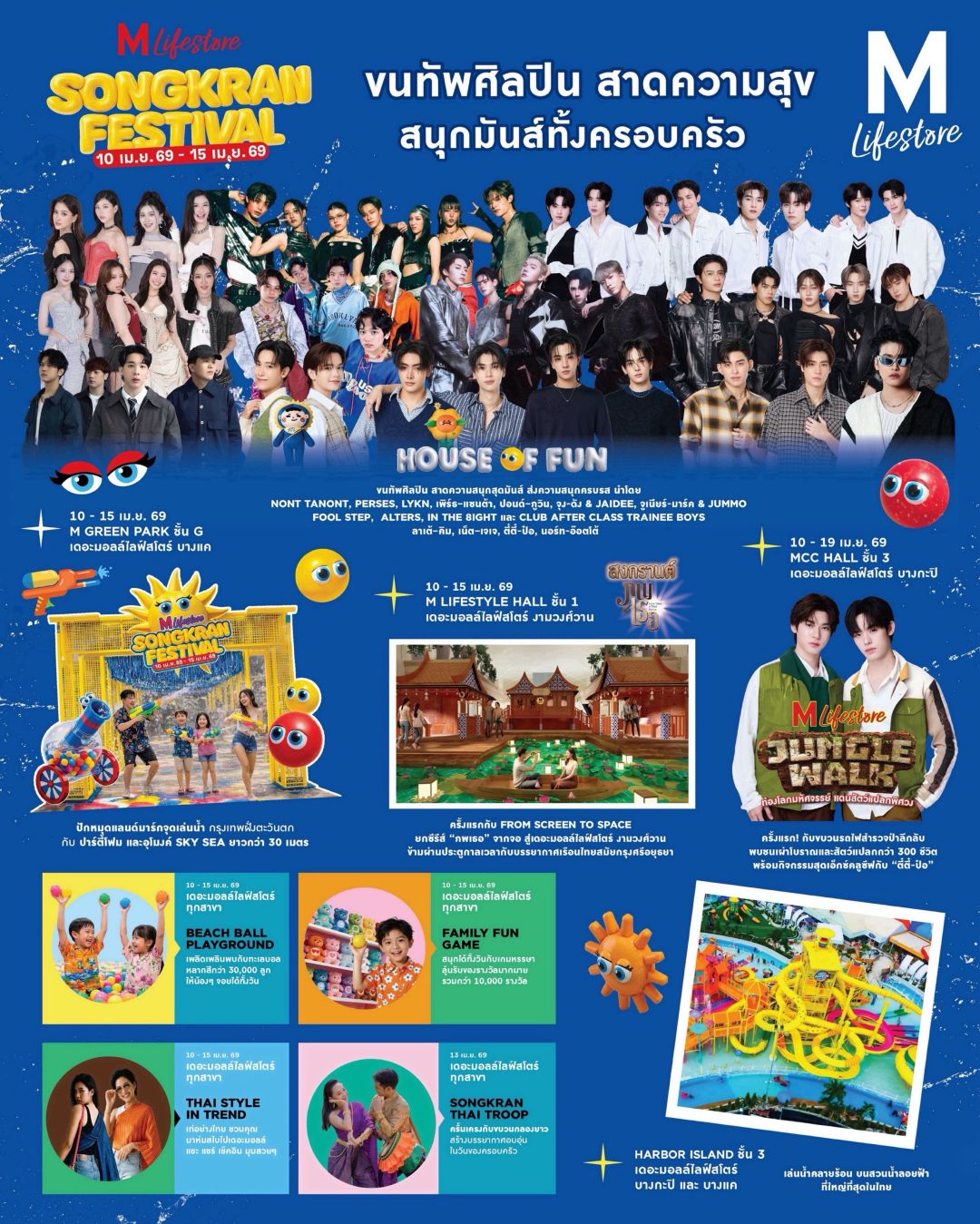 นอกจากนี้ ยังมีกิจกรรมความสนุกอีกมากมาย ไม่ว่าจะเป็น BEACH BALL PLAYGROUND บ่อบอลยักษ์กว่า 30,000 ลูก ใจกลางห้าง และ FAMILY FUN GAME เกมสนุกสไตล์ไทย ลุ้นรับของรางวัลมากมายกว่า 10,000 ชิ้น พิเศษ! ในวันที่ 13 เมษายน 2569 ฉลองวันครอบครัว ด้วยกลิ่นอายความเป็นไทยกับ THAI TROOP สนุกสนานกับขบวนกลองยาวสุดครื้นเครง และการแสดงไทยประยุกต์ปิดท้ายความสนุกสำหรับทุกคนในครอบครัว กับงาน THE MALL LIFESTORE JUNGLE WALK ท่องโลกมหัศจรรย์ แดนสัตว์แปลกพิศวง ที่ชวนเด็กๆ และครอบครัวมาร่วมเปิดประสบการณ์ ในแดนป่าต้องคำสาป ครั้งแรก! กับขบวนรถไฟสำรวจป่าลึกลับ พบชนเผ่าโบราณและสัตว์แปลกกว่า 300 ชีวิต พร้อมสนุกกับกิจกรรมมากมาย จัดขึ้นที่ MCC HALL ชั้น 3 เดอะมอลล์ ไลฟ์สโตร์ บางกะปิ ระหว่างวันที่ 10–19 เมษายน 2569 หรือเย็นฉ่ำได้ทั้งครอบครัวกับการเปิดประสบการณ์ความสนุกแบบเต็มพิกัดกับเครื่องเล่นและกิจกรรมคลายร้อนที่ HARBOR ISLAND สวนน้ำลอยฟ้าระดับเวิลด์คลาส ที่ใหญ่ที่สุดในประเทศไทย บนพื้นที่กว่า 10,000 ตารางเมตร ที่เดอะมอลล์ไลฟ์สโตร์ บางแค และบางกะปิ