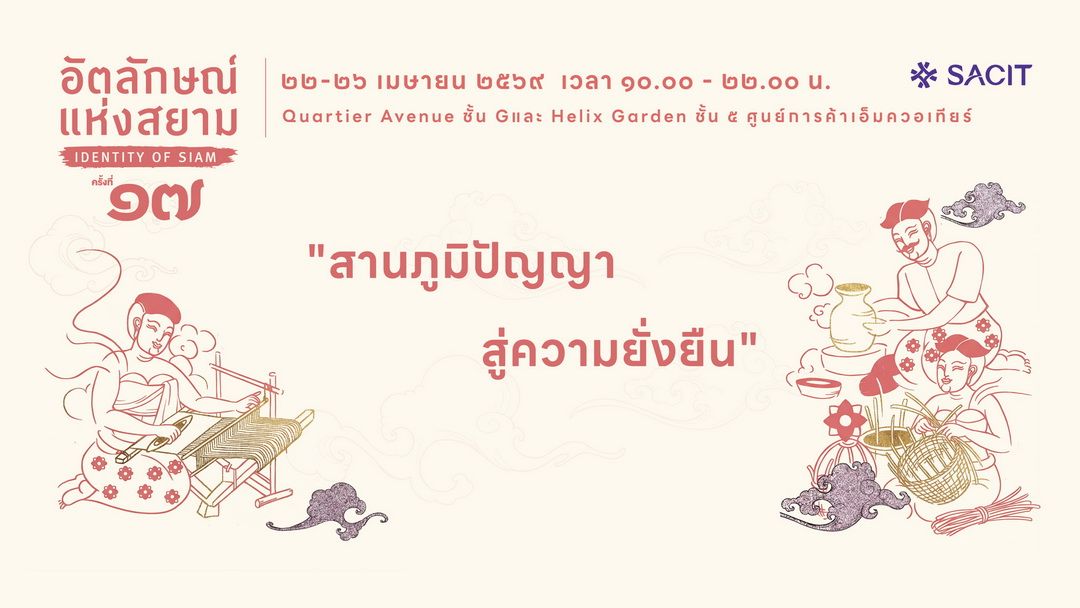 SACIT ขอเชิญชวนทุกท่านร่วมเป็นส่วนหนึ่งในการสนับสนุนงานศิลปหัตถกรรมไทย มาสัมผัสเสน่ห์ของภูมิปัญญาไทยผ่านผลงานช่างฝีมือชั้นครู ที่ทั้งงดงามและทรงคุณค่า หาชมได้ยาก พร้อมเลือกซื้องานหัตถศิลป์ไทยที่มีคุณภาพรวบรวมไว้ในที่เดียวในงาน “อัตลักษณ์แห่งสยาม ครั้งที่ 17” ระหว่างวันที่ 22 – 26 เมษายน 2569 ณ ควอเทียร์ อเวนิว ชั้น G และ เฮลิค การ์เด้นท์ ชั้น 5 ศูนย์การค้าเอ็มควอเทียร์ กรุงเทพมหานคร เดินทางสะดวกด้วย BTS สถานีพร้อมพงษ์ (ทางออก 1) สอบถามเพิ่มเติม โทร. 1289 หรือ FacebookSACIT Shop