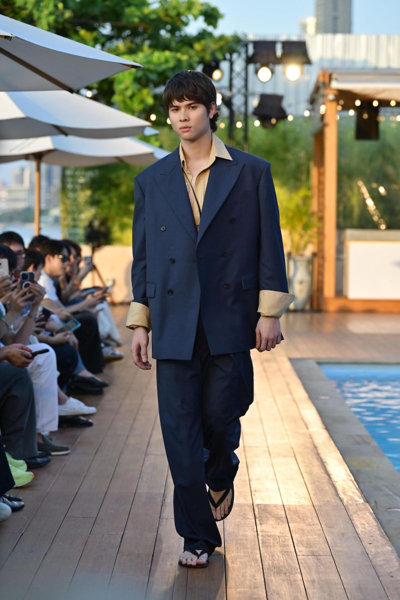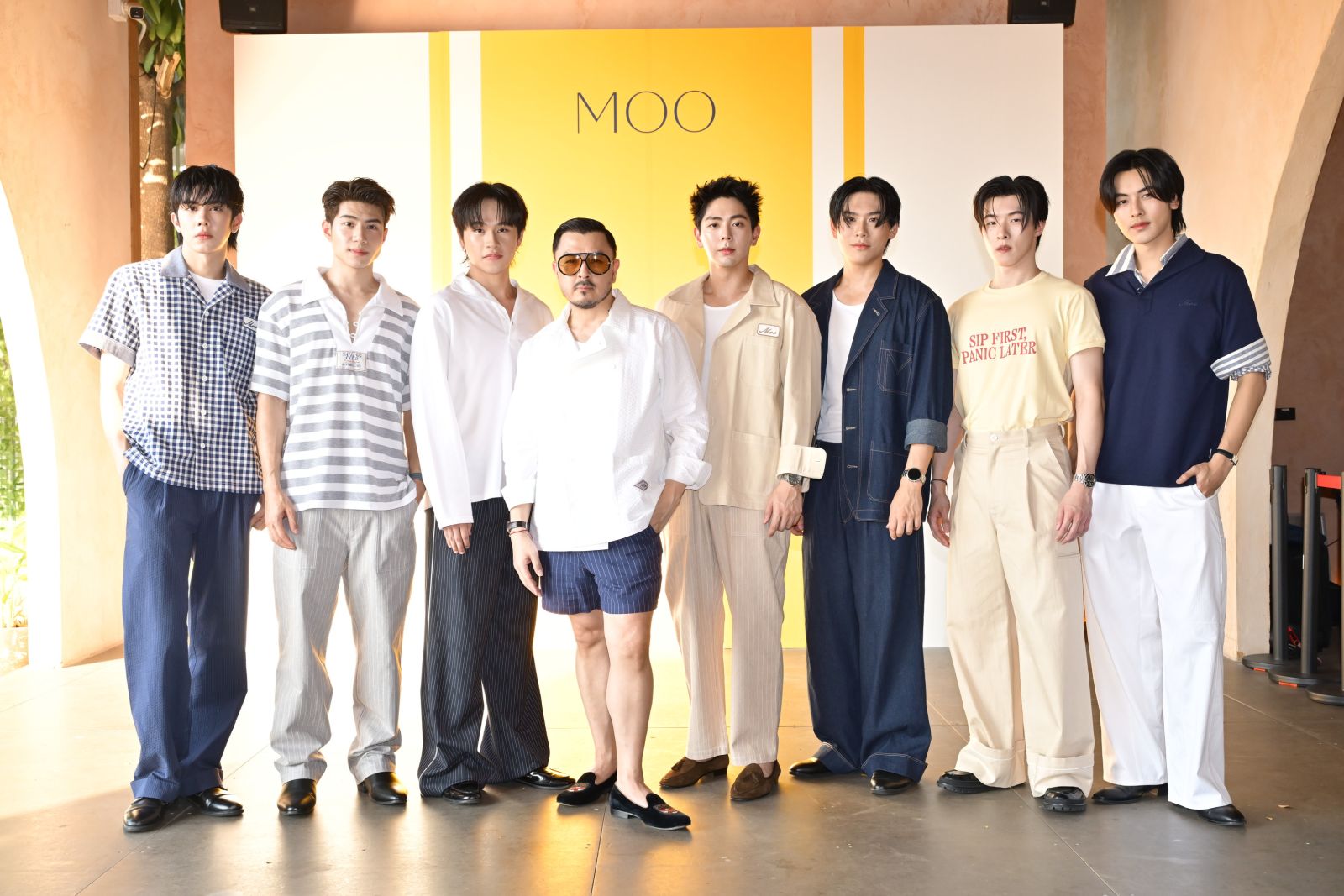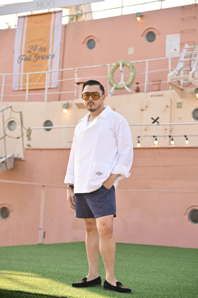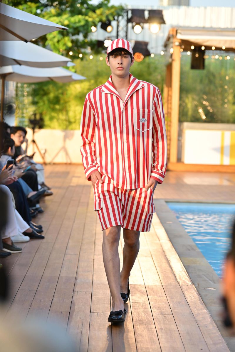 บรรยากาศของการพักผ่อนริมสระในฤดูร้อนถูกนำมาหลอมรวมเข้ากับโครงเสื้อผ้าของ MOO สะท้อนช่วงเวลาแห่งความผ่อนคลายที่เรียบง่ายแต่มีสไตล์ ผ่านไอเทมอย่างเสื้อเชิ้ตลายทาง (Stripe Shirt) ที่เพิ่มลูกเล่นด้วยดีเทลคอปกกะลาสี (Sailor Collar) พร้อมการไล่เฉดสีตั้งแต่โทนขาว-ดำ ไปจนถึงลายทางหลายสี (Multi Stripe) ควบคู่ไปกับเทคนิคตัดต่อที่ช่วยเพิ่มมิติให้กับเสื้อผ้า เสริมด้วยกางเกงขาสั้นทรงกูรข่า (Gurkha Pants) ที่ตอบโจทย์ลุค Casual Sartorial โดดเด่นด้วยขอบเอวหนาพร้อมสายปรับกระชับ (Buckle Strap) และชุดเอี๊ยม (Overalls) ที่สะท้อนกลิ่นอายวินเทจในแบบฉบับของ MOO