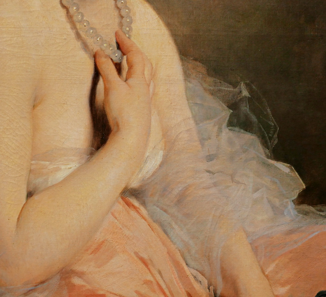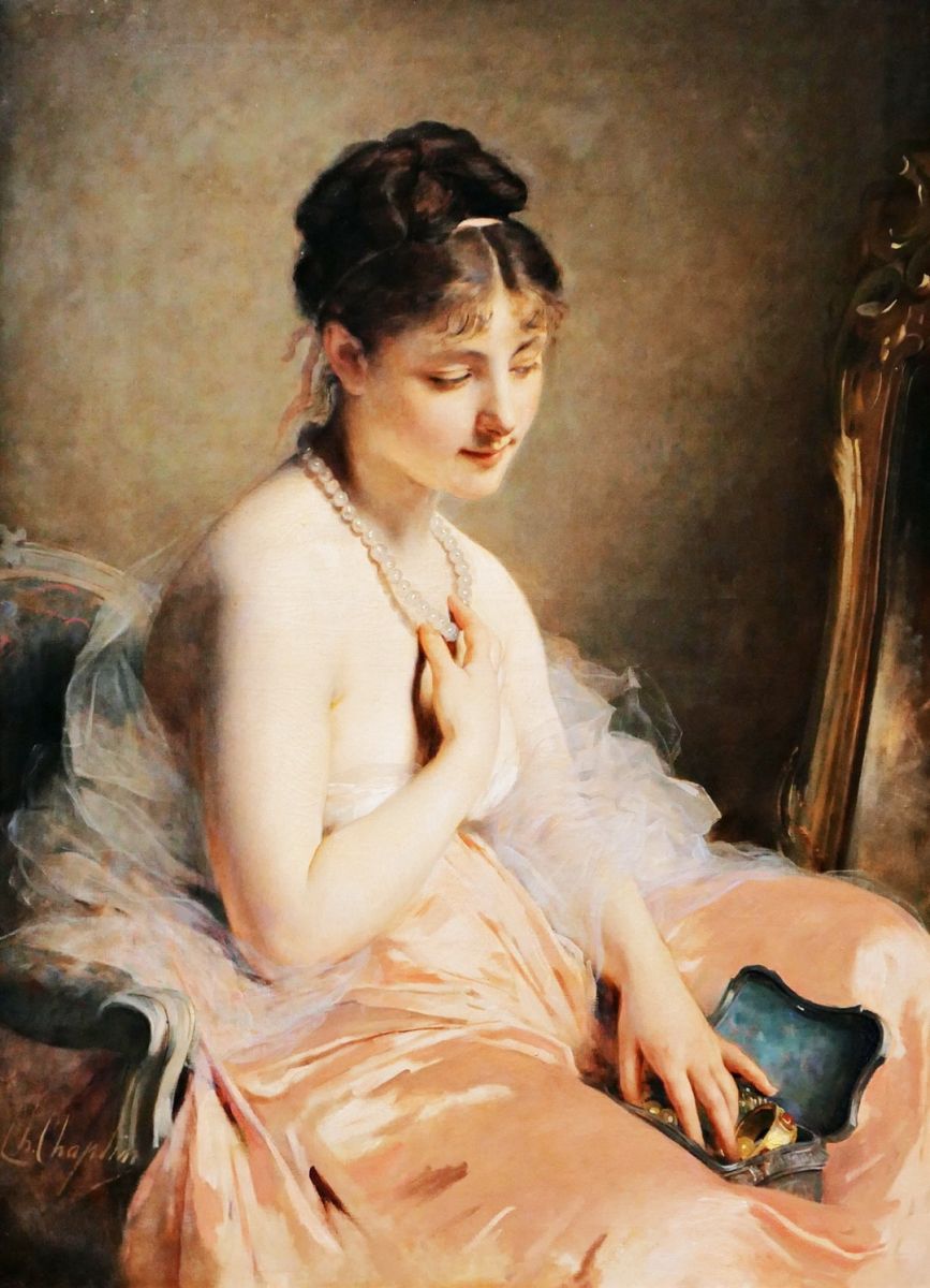 ผลงานชิ้นแรก The Pearl Necklace ของ Charles Chaplin จิตรกรชาวฝรั่งเศสที่มีชื่อคล้ายกับศิลปินตลกชื่อดัง Charles Chaplin ที่มีชื่อเต็มว่า Charles Joshua Chaplin เกิดวันที่ 8 มิถุนายน 1825 ที่ Les Andelys ฝรั่งเศสกับมารดาที่เป็นชาวฝรั่งเศส และบิดาที่เป็นนายหน้าขายภาพชาวอังกฤษ เขาเรียนศิลปะที่ Ecole des Beaux-Arts ในกรุงปารีสก่อนจะศึกษาส่วนตัวที่ห้องภาพของ Michel Martin Drolling ซึ่งเป็นผู้ฝึกศิลปะให้กับศิลปินอีกหลายคน อาทิ Paul Baudry, Jules Breton ก่อนเข้าเป็นอาจารย์ที่ Ecole des Beaux-Arts เขาได้มีโอกาสส่งผลงานเข้าแข่งขันในนิทรรศการ Academie des Beaux-Arts โดยส่งภาพเหมือนเข้าประกวด วิชาหลักที่เขาสอนก็คือ การวาดภาพเหมือนผู้หญิง แต่เขาก็ยังชำนาญในการวาดภาพทิวทัศน์ด้วยโดยเฉพาะอย่างยิ่งทิวทัศน์ชนบทแถว Auvergne ภาพผู้หญิงกึ่งเปลือยท่อนบนนั่งหน้ากระจกกำลังลองสร้อยไข่มุกซึ่งเป็นภาพตามแบบฉบับดั้งเดิมที่นิยมเขียนกันในวงการศึกษาในช่วงเวลานั้นแสดงให้เห็นถึงอัจฉริยภาพของศิลปินได้อย่างเด่นชัด ไม่ว่าจะเป็นสัดส่วนของร่างกาย ความพริ้วไหวของผืนผ้า และที่สำคัญความสวยงามของใบหน้าที่ดูนุ่มนวลกระจ่างใสราวกับเทพธิดาเลยทีเดียว