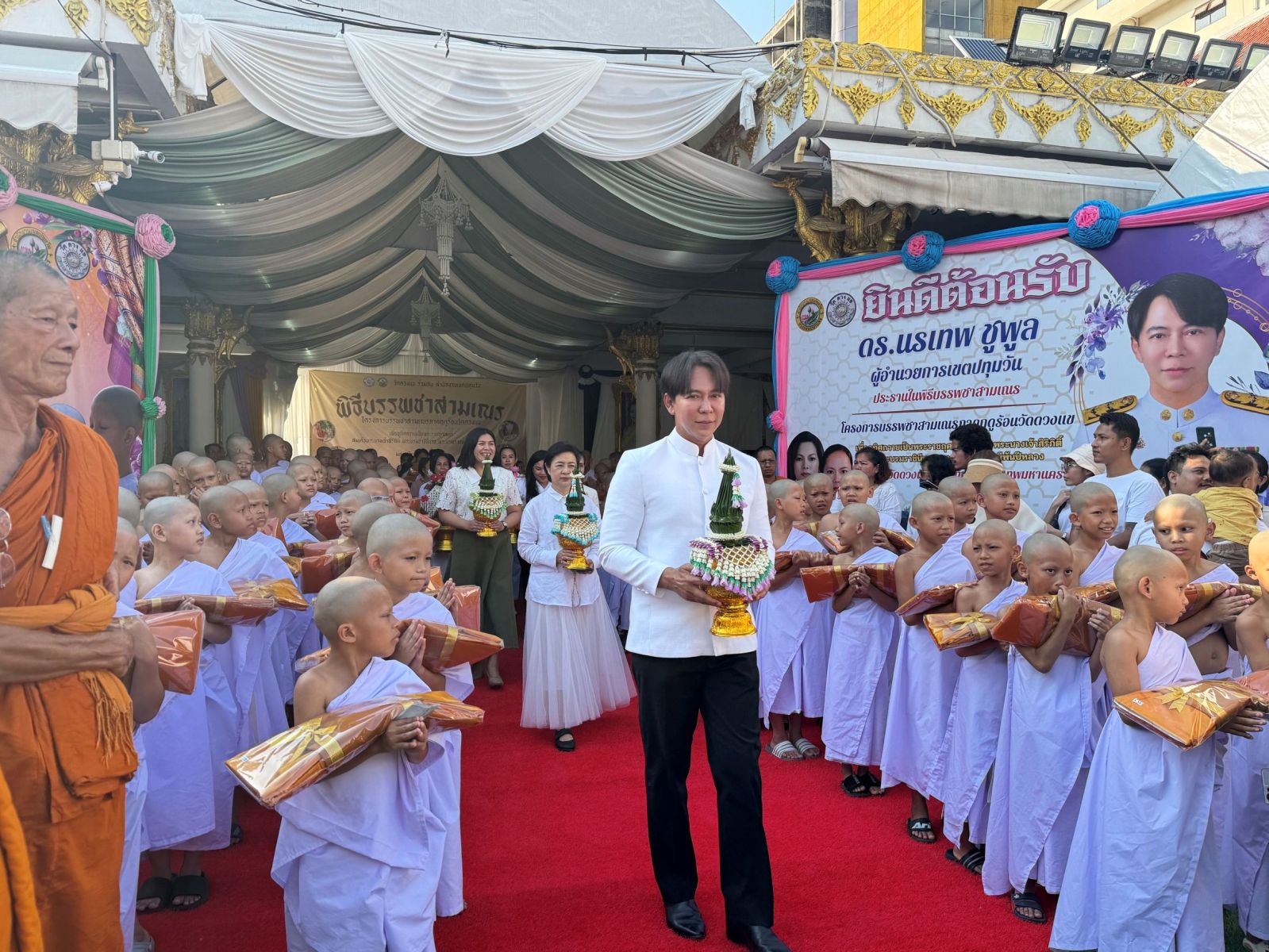 สำนักงานเขตปทุมวัน นำโดย ดร. นรเทพ ชูพูล ผู้อำนวยการเขตปทุมวัน จัดพิธีบรรพชาสามเณร ภาคฤดูร้อน ประจำปี 2569 จำนวน 96 รูป เพื่อถวายเป็นพระราชกุศลแด่ สมเด็จพระนางเจ้าสิริกิติ์ พระบรมราชินีนาถ พระบรมราชชนนีพันปีหลวง ในการนี้บริษัท เอ็ม บี เค จำกัด (มหาชน) โดย ศตกมล วรกุล ผู้อำนวยการอาวุโสฝ่ายสื่อสารองค์กร บริษัท อินเทลลิเจ้นท์ ครีเอทีฟ แอนด์ มาร์เก็ตติ้ง จำกัด เป็นตัวแทนผู้บริหาร MBK ร่วมเป็นเจ้าภาพบรรพชาสามเณร จำนวน 5 รูป ณ วัดดวงแข