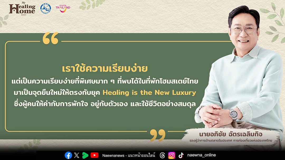 นายอภิชัย ฉัตรเฉลิมกิจ รองผู้ว่าการด้านตลาดในประเทศ การท่องเที่ยวแห่งประเทศไทย เผยวิสัยทัศน์การต่อยอดแนวคิดดังกล่าว ผ่านโครงการใหม่ “ที่พักฮีลใจ: My Healing Home” ซึ่งถูกออกแบบให้เป็นมากกว่าที่พัก แต่เป็นพื้นที่พักพิงทางใจที่ช่วยเติมเต็มความสุข และสะท้อนทิศทางใหม่ของการท่องเที่ยวไทยที่มุ่งสร้างทั้งคุณค่า ประสบการณ์ และความยั่งยืนไปพร้อมกัน
